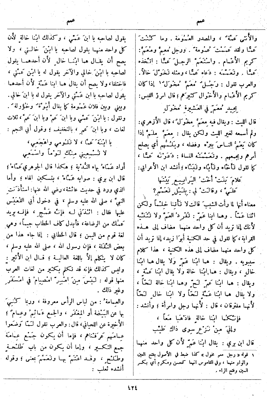 ، والأُنثى عَمَّةٌ، وَالْمَصْدَرُ العُمُومة. وَمَا كُنْتَ عَمّاً وَلَقَدْ عَمَمْتَ عُمُومةً. وَرَجُلٌ مُعِمٌّ ومُعَمٌّ: كَرِيمُ الأَعْمام. واسْتَعَمَّ الرجلَ عَمّاً: اتَّخذه عَمّاً. وتَعَمَّمَه: دَعاه عَمّاً، وَمِثْلُهُ تَخَوَّلَ خَالًا. وَالْعَرَبُ تَقُولُ: رَجُلٌ مُعَمٌّ مُخْوَلٌ «1» إِذَا كَانَ كَرِيمَ الأَعْمام والأَخْوال كثيرَهم؛ قَالَ امْرُؤُ الْقَيْسِ: