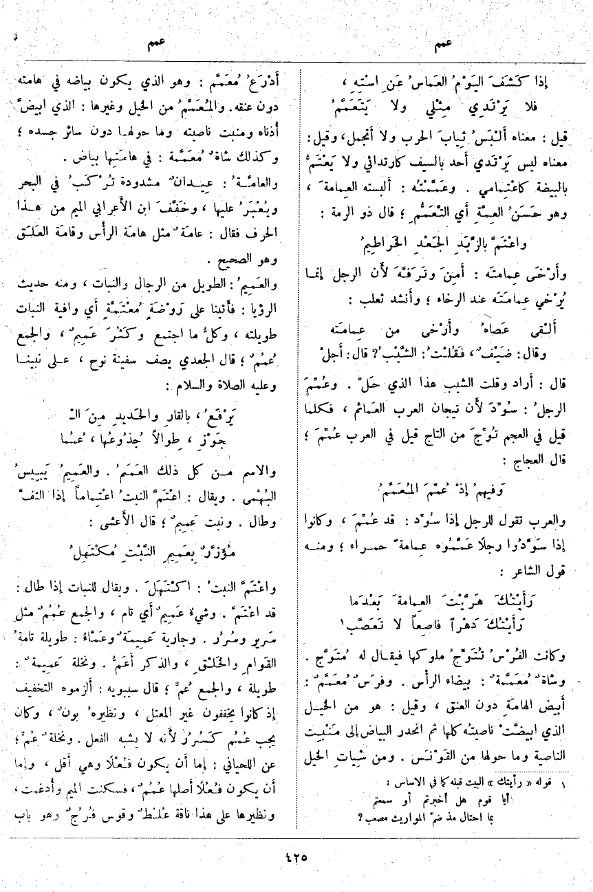 واعْتَمَّ النبتُ: اكْتَهَلَ. وَيُقَالُ لِلنَّبَاتِ إِذَا طَالَ: قَدِ اعْتَمَّ. وَشَيْءٌ عَمِيمٌ أَيْ تَامٌّ، وَالْجَمْعُ عُمُمٌ مِثْلُ سَرير وسُرُر. وَجَارِيَةٌ عَمِيمَةٌ وعَمَّاءُ: طَوِيلَةٌ تامةُ القَوامِ والخَلْقِ،، وَالذَّكَرُ أَعَمُّ. وَنَخْلَةٌ عَمِيمةٌ: طَوِيلَةٌ، وَالْجَمْعُ عُمٌّ؛ قَالَ سِيبَوَيْهِ: أَلزموه التَّخْفِيفَ إِذْ كَانُوا يُخَفِّفُونَ غَيْرَ الْمُعْتَلِّ، ونظيرهُ بونٌ، وَكَانَ يَجِبُ عُمُم كَسُرُر لأَنه لَا يُشْبِهُ الْفِعْلَ. ونخلةٌ عُمٌّ؛ عَنِ اللِّحْيَانِيِّ: إِمَّا أَن يَكُونَ فُعْلًا وَهِيَ أَقل، وَإِمَّا أَن يَكُونَ فُعُلًا أَصْلُهَا عُمُمٌ، فَسَكَنَتِ الْمِيمُ وأُدغمت، وَنَظِيرُهَا عَلَى هَذَا نَاقَةٌ عُلُطٌ وَقَوْسٌ فُرُجٌ وَهُوَ باب