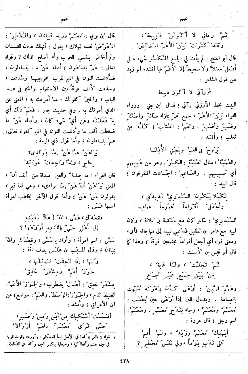 الْبَيْتُ بِخَطِّ الأَرزني رَآنِي؛ قَالَ ابْنُ جِنِّي: وَرَوَاهُ الْفَرَّاءُ بَيْنَ الأَعُمِّ، جَمْعُ عَمّ بِمَنْزِلَةِ صَكّ وأصُكّ وضَبّ وأَضُبّ. والعَمُّ: العُشُبُ؛ كُلُّهُ عَنْ ثَعْلَبٍ؛ وأَنشد: