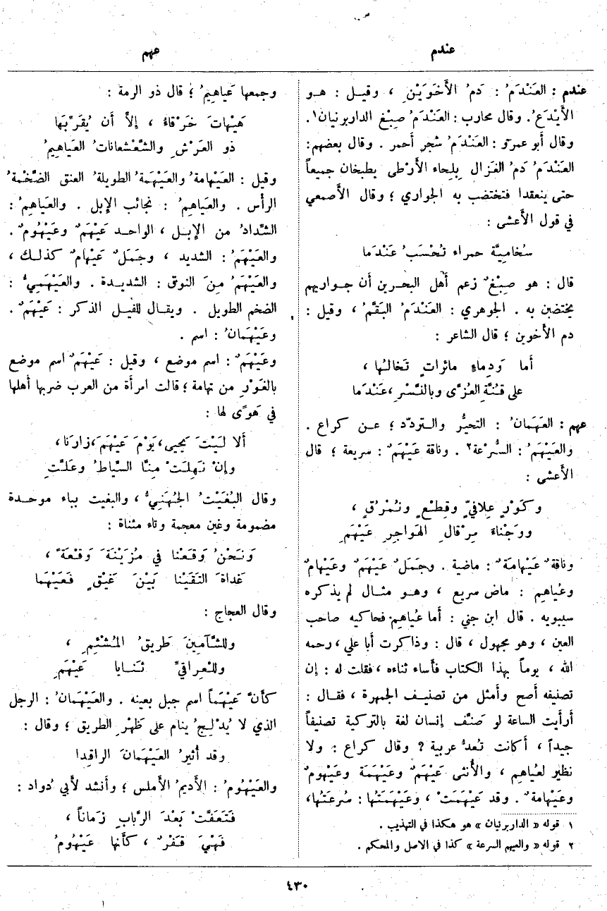 عندم: العَنْدَمُ: دَمُ الأَخَوَيْنِ. وَقِيلَ: هُوَ الأَيْدَعُ. وَقَالَ مُحَارِبٌ العَنْدَم صِبْغ الدَّارْبَرْنَيَانِ «1». وَقَالَ أَبو عَمْرٍو: العَنْدَمُ شَجَرٌ أَحمر. وَقَالَ بَعْضُهُمُ: العَنْدَمُ دمُ الغَزال بِلِحاء الأَرْطى يُطْبَخَانِ جَمِيعًا حَتَّى يَنْعَقِدَا فَتَخْتَضِبَ بِهِ الْجَوَارِي؛ وَقَالَ الأَصمعي فِي قَوْلِ الأَعشى: