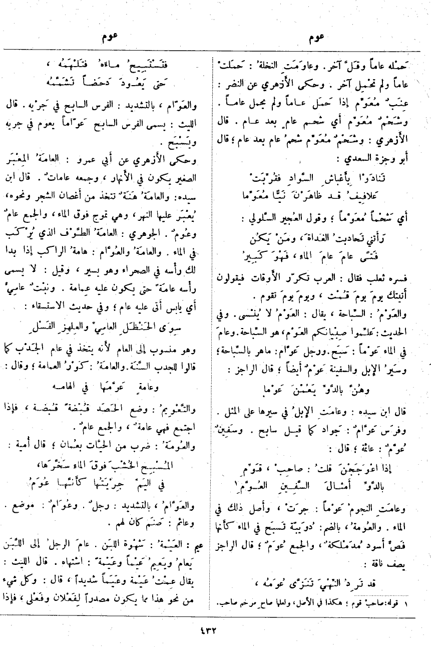 والعَوّام، بِالتَّشْدِيدِ: الْفَرَسُ السَّابِحُ فِي جَرْيه. قَالَ اللَّيْثُ: يُسَمَّى الْفَرَسُ السَّابِحُ عَوّاماً يَعُومُ فِي جَرْيِهِ ويَسْبَح. وَحَكَى الأَزهري عَنْ أَبي عَمْرٍو: العامَةُ المِعْبَر الصَّغِيرُ يَكُونُ فِي الأَنهار، وَجَمْعُهُ عاماتٌ. قَالَ ابْنُ سِيدَهْ: والعامَةُ هَنَةٌ تُتَّخَذُ مِنْ أَغصان الشَّجَرِ وَنَحْوِهِ، يُعْبَر عَلَيْهَا النَّهْرُ، وَهِيَ تَمُوجُ فَوْقَ الْمَاءِ، وَالْجَمْعُ عامٌ وعُومٌ. الْجَوْهَرِيُّ: العامَةُ الطَّوْف الَّذِي يُرْكَب فِي الْمَاءِ. والعامَةُ والعُوَّام: هامةُ الرَّاكِبِ إِذَا بَدَا لَكَ رأْسه فِي الصَّحْرَاءِ وَهُوَ يَسِيرُ، وَقِيلَ: لَا يُسَمَّى رأْسه عامَةً حَتَّى يَكُونَ عَلَيْهِ عِمامة. ونبْتٌ عامِيٌّ أَي يَابِسٌ أَتى عَلَيْهِ عَامٌ؛ وَفِي حَدِيثِ الِاسْتِسْقَاءِ: