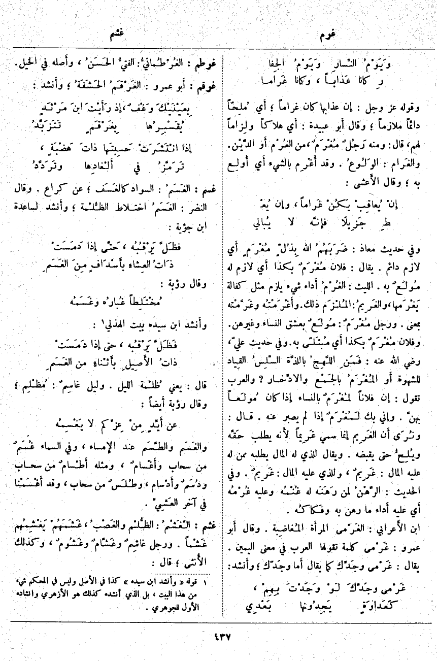 وَالْعَرَبُ تَقُولُ: إِنَّ فُلَانًا لمُغْرَمٌ بِالنِّسَاءِ إِذَا كَانَ مُولَعاً بهنَّ. وَإِنِّي بِكَ لَمُغْرَمٌ إِذَا لَمْ يَصْبِرْ عَنْهُ. قَالَ: ونُرَى أَنَّ الغَرِيم إِنَّمَا سُمِّيَ غَرِيماً لأَنه يَطْلُبُ حَقَّه ويُلِحُّ حَتَّى يَقْبِضَهُ. وَيُقَالُ لِلَّذِي لَهُ الْمَالُ يَطْلُبُهُ مِمَّنْ لَهُ عَلَيْهِ الْمَالُ: غَرِيمٌ، وَلِلَّذِي عَلَيْهِ الْمَالُ: غَرِيمٌ. وَفِي الْحَدِيثِ: