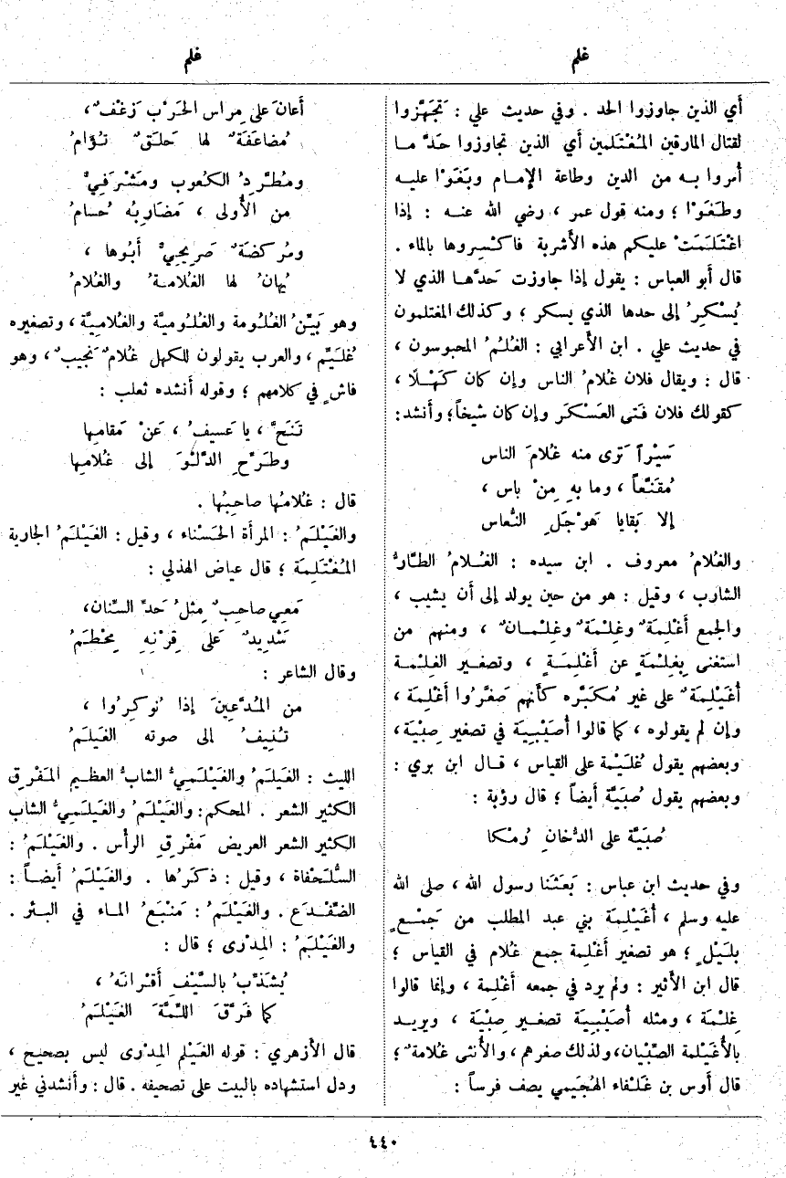 قَالَ أَبو الْعَبَّاسِ: يَقُولُ إِذَا جَاوَزَتْ حَدَّها الَّذِي لَا يُسْكِرُ إِلَى حَدِّهَا الَّذِي يُسْكِرُ، وَكَذَلِكَ الْمُغْتَلِمُونَ فِي حَدِيثِ عَلِيٍّ. ابْنُ الأَعرابي: الغُلُمُ الْمَحْبُوسُونَ، قَالَ: وَيُقَالُ فُلَانٌ غُلامُ النَّاسِ وَإِنْ كَانَ كَهْلًا، كَقَوْلِكَ فُلَانٌ فَتى العَسْكَر وَإِنْ كَانَ شَيْخًا؛ وأَنشد: