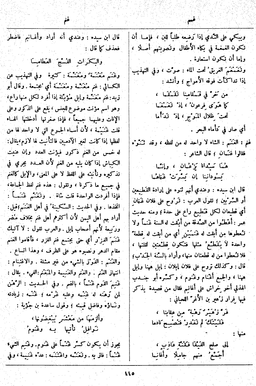 غنم: الغَنَم: الشَّاءُ لَا وَاحِدَ لَهُ مِنْ لَفْظِهِ، وَقَدْ ثَنَّوْه فَقَالُوا غنَمانِ؛ قَالَ الشَّاعِرُ: