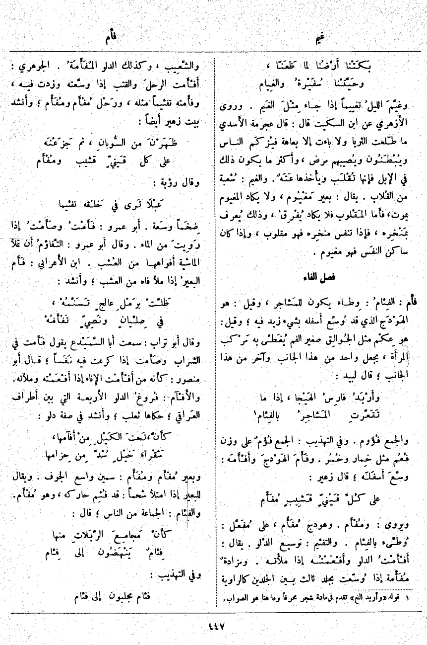 وَقَالَ أَبُو تُرَابٍ: سَمِعْتُ أَبَا السَّمَيْدع يَقُولُ فَأَمت فِي الشَّرَابِ وصَأَمت إِذَا كَرَعْتَ فِيهِ نَفَساً؛ قَالَ أَبُو مَنْصُورٍ: كأَنه مِنْ أَفْأَمْت الإِناء إِذَا أَفْعَمْته وملأَته. والأَفْآم: فُروغُ الدَّلْوِ الأَربعة الَّتِي بَيْنَ أَطْرَافِ العَراقي؛ حَكَاهَا ثَعْلَبٌ؛ وَأَنْشَدَ فِي صِفَةِ دَلْوٍ: