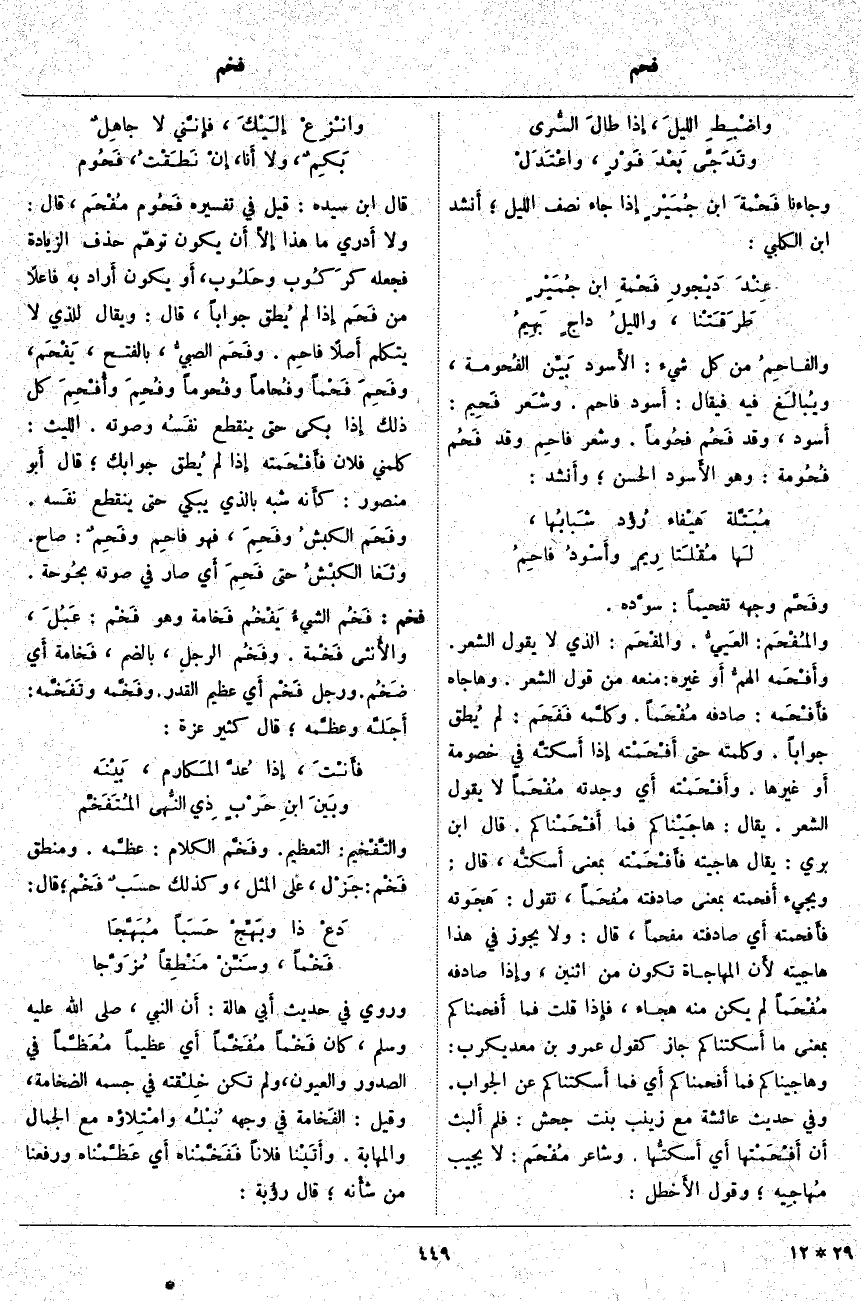 وفَحَّم وَجْهَهُ تَفْحِيمًا: سوَّده. والمُفْحَم: العَييُّ. والمفْحَم: الَّذِي لَا يَقُولُ الشِّعْرَ. وأفْحَمه الهمُّ أَوْ غَيْرُهُ: مَنَعَهُ مِنْ قَوْلِ الشِّعْرِ. وَهَاجَاهُ فأَفْحَمه: صَادَفَهُ مُفْحَماً. وكلَّمه فَفَحَم: لَمْ يُطق جَوَابًا. وَكَلَّمْتُهُ حَتَّى أَفْحَمْته إِذَا أَسكتَّه فِي خُصُومَةٍ أَوْ غَيْرِهَا. وأَفْحَمْته أَيْ وَجَدْتُهُ مُفْحَماً لَا يَقُولُ الشِّعْرَ. يُقَالُ: هاجَيْناكم فَمَا أَفْحَمْناكم. قَالَ ابْنُ بَرِّيٍّ: يُقَالُ هَاجَيْتُهُ فأَفْحَمْته بِمَعْنَى أَسكتُّه، قَالَ: وَيَجِيءُ أَفحمته بِمَعْنَى صَادَفْتُهُ مُفحَماً، تَقُولُ: هَجَوته فأَفحمته أَيْ صَادَفْتَهُ مُفْحَمًا، قَالَ: وَلَا يَجُوزُ فِي هَذَا هَاجَيْتُهُ لأَن الْمُهَاجَاةَ تَكُونُ مِنِ اثْنَيْنِ، وَإِذَا صَادَفَهُ مُفْحَماً لَمْ يَكُنْ مِنْهُ هِجَاءٌ، فَإِذَا قُلْتَ فَمَا أَفحمناكم بِمَعْنَى مَا أَسكتناكم جَازَ كَقَوْلِ عَمْرِو بْنِ مَعْدِيكَرِبَ: وَهَاجَيْنَاكُمْ فَمَا أَفْحَمْنَاكُمْ أَيْ فَمَا أَسكتناكم عَنِ الْجَوَابِ. وَفِي حَدِيثِ