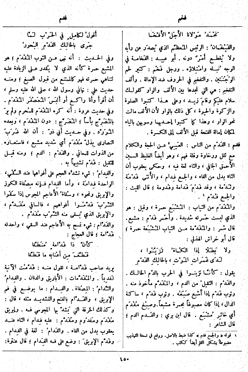 (1). قوله [والجمع فدم] كذا ضبط بالأصل. ووقع في نسخة التهذيب مضبوطاً بشكل القلم أيضاً ككتب