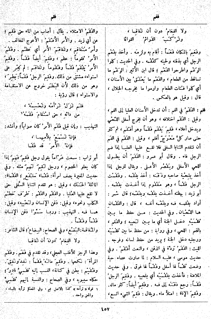 فقم: الفَقَمُ فِي الْفَمِ: أَنْ تَدْخُلَ الأَسنان الْعُلْيَا إِلَى الْفَمِ، وَقِيلَ: الفَقَم اخْتِلَافُهُ، وَهُوَ أَنْ يَخْرُجَ أَسْفَلُ اللَّحْي وَيَدْخُلَ أَعْلَاهُ، فَقِمَ يَفْقَم فَقَماً وَهُوَ أَفْقَم، ثُمَّ كَثُرَ حَتَّى صَارَ كلُّ مُعْوَجٍّ أَفقم، وَقِيلَ: الفَقَم فِي الفَم أَنْ تَتَقَدَّمَ الثَّنَايَا السُّفْلَى فَلَا تَقَعُ عَلَيْهَا الْعُلْيَا إِذَا ضَمَّ الرَّجُلُ فَاهُ. وَقَالَ أَبُو عَمْرٍو: الفَقَمُ أَنْ يَطُولَ اللَّحْيُ الأَسفل ويَقْصُر الأَعلى. وَيُقَالُ لِلرَّجُلِ إِذَا أَخذ بِلِحْية صَاحِبِهِ وذَقَنه: أَخَذَ بفُقْمه. وفَقَمْت الرَّجُلَ فَقْماً، وَهُوَ مَفْقُوم إذا أخدت بفُقْمه. أَبُو زَيْدٍ: بَهَظْتُهُ أَخذت بفُقْمه وبفُغْمه؛ قَالَ شَمِرٌ: أَرَادَ بفُقمه فَمَهُ وبفُغْمه أَنْفَهُ، قَالَ: والفُقْمانِ هُمَا اللَّحْيان. وَفِي الْحَدِيثِ: