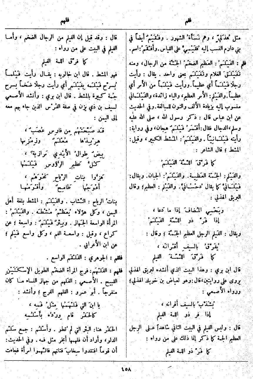 فلم: الفَيْلَمُ: العَظيم الضخْمُ الجُثَّة مِنَ الرِّجَالِ، وَمِنْهُ تَفَيْلَقَ الْغُلَامِ وتَفَيْلَم بِمَعْنًى وَاحِدٍ. يُقَالُ: رأَيت رَجُلًا فَيْلَماً أَيْ عَظِيمًا. ورأَيت فَيْلَماً مِنَ الأَمر أَيْ عَظِيمًا. والفَيْلم: الأَمر الْعَظِيمُ، وَالْيَاءُ زَائِدَةٌ، والفَيْلَماني مَنْسُوبٌ إِلَيْهِ بِزِيَادَةِ الأَلف وَالنُّونِ لِلْمُبَالَغَةِ. وَفِي الْحَدِيثِ