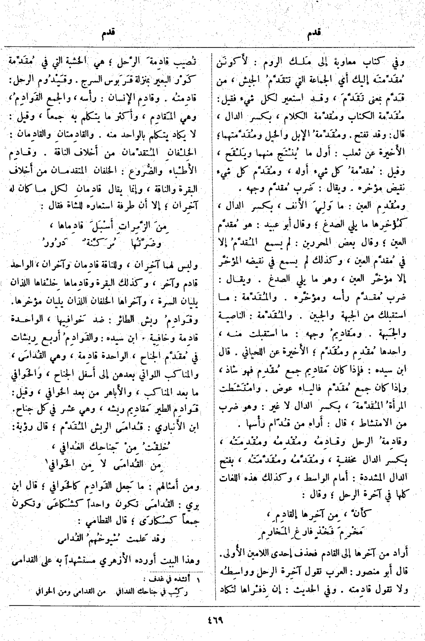 أَي الْجَمَاعَةَ الَّتِي تتقَدَّمُ الْجَيْشَ، مِنْ قَدَّم بِمَعْنَى تَقَدَّمَ، وَقَدِ اسْتُعِيرَ لِكُلِّ شَيْءٍ فَقِيلَ: مُقَدِّمة الْكِتَابِ ومُقدِّمة الْكَلَامِ، بِكَسْرِ الدَّالِ، قَالَ: وَقَدْ تُفْتَحُ. ومُقَدِّمةُ الإِبل وَالْخَيْلِ ومُقَدَّمتهما، الأَخيرة عَنْ ثَعْلَبٍ: أَول مَا يُنْتَج مِنْهُمَا ويَلْقَح، وَقِيلَ: مُقَدِّمةُ كُلِّ شَيْءٍ أَوله، ومُقَدَّم كُلِّ شَيْءٍ نَقِيضُ مُؤَخَّرِهِ. وَيُقَالُ: ضَرب مُقدَّم وَجْهِهِ. ومُقْدِم الْعَيْنِ: مَا وَلِيَ الأَنف، بِكَسْرِ الدَّالِ، كَمُؤْخِرها مَا يَلِي الصُّدْغَ، وَقَالَ أَبو عُبَيْدٍ: هُوَ مُقدَّم الْعَيْنِ وَقَالَ بَعْضُ الْمُحَرِّرِينَ: لَمْ يُسْمَعِ المُقدَّمُ إِلا فِي مُقدَّم الْعَيْنِ، وَكَذَلِكَ لَمْ يُسْمَعُ فِي نَقِيضِهِ المؤخَّر إِلا مؤخَّر الْعَيْنِ، وَهُوَ مَا يَلِي الصُّدْغَ. وَيُقَالُ: ضَرَبَ مُقدَّم رأْسه ومؤخَّره. والمُقَدِّمة: مَا اسْتَقْبَلَكَ مِنَ الْجَبْهَةِ وَالْجَبِينِ. والمُقَدِّمة: النَّاصِيَةُ والجَبهة. ومَقادِيم وَجْهِهِ: مَا اسْتَقْبَلْتَ مِنْهُ، وَاحِدُهَا مُقْدِم ومُقَدِّم، الأَخيرة عَنِ اللِّحْيَانِيِّ. قَالَ ابْنُ سِيدَهْ: فإِذا كَانَ مَقادِيم جَمْعَ مُقْدِم فَهُوَ شَاذٌّ، وإِذا كَانَ جَمْعَ مُقَدِّم فَالْيَاءُ عِوَضٌ. وامْتَشَطت المرأَةُ المُقدِّمةَ، بِكَسْرِ الدَّالِ لَا غَيْرَ: وَهُوَ ضَرْبٌ مِنَ الِامْتِشَاطِ، قَالَ: أَراه مِنْ قُدّام رأْسها. وقادِمةُ الرَّحْلِ وقادِمُه ومُقْدِمُه ومُقْدِمَتُه، بِكَسْرِ الدَّالِ مُخَفَّفَةٌ، ومُقَدَّمُه ومُقَدَّمَتُه، بِفَتْحِ الدَّالِ الْمُشَدَّدَةِ: أَمام الْوَاسِطِ، وَكَذَلِكَ هَذِهِ اللُّغَاتُ كُلُّهَا فِي آخِرَةِ الرَّحْلِ، وَقَالَ:
