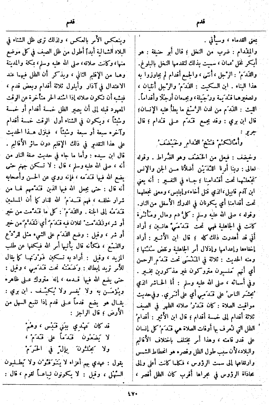 ، قَالَ ابْنُ الأَثير: أَقْدَامُ الظِّلِّ الَّتِي تُعرف بِهَا أَوقات الصَّلَاةِ هِيَ قَدَمُ كُلِّ إِنسان عَلَى قَدْرِ قَامَتِهِ، وَهَذَا أَمر يَخْتَلِفُ بِاخْتِلَافِ الأَقاليم وَالْبِلَادِ، لأَن سَبَبَ طُولِ الظِّلِّ وَقِصَرِهِ هُوَ انْحِطَاطُ الشَّمْسِ وارتفاعها إِلى سمت الرؤوس، فَكُلَّمَا كَانَتْ أَعلى وإِلى محاذاة الرؤوس فِي مَجْرَاهَا أَقرب كَانَ الظِّلُّ أَقصر، وَيَنْعَكِسُ الأَمر بِالْعَكْسِ، وَلِذَلِكَ تَرَى ظِلَّ الشِّتَاءِ فِي الْبِلَادِ الشَّمَالِيَّةِ أَبداً أَطول مِنْ ظِلِّ الصَّيْفِ فِي كُلِّ مَوْضِعٍ مِنْهَا، وَكَانَتْ صَلَاتُهُ، صَلَّى اللَّه عَلَيْهِ وَسَلَّمَ، بِمَكَّةَ وَالْمَدِينَةِ وَهُمَا مِنَ الإِقليم الثَّانِي، وَيُذْكَرُ أَن الظِّلَّ فِيهِمَا عِنْدَ الِاعْتِدَالِ فِي آذَارَ وأَيلول ثَلَاثَةُ أَقْدَام وَبَعْضُ قَدَمٍ، فَيُشْبِهُ أَن تَكُونَ صَلَاتُهُ إِذا اشْتَدَّ الْحَرُّ متأَخرة عَنِ الْوَقْتِ الْمَعْهُودِ قَبْلَهُ إِلى أَن يَصِيرَ الظِّلُّ خَمْسَةَ أَقدام أَو خَمْسَةً وَشَيْئًا، وَيَكُونَ فِي الشِّتَاءِ أَول الْوَقْتِ خَمْسَةَ أَقْدَامٍ وَآخِرَهُ سَبْعَةً أَو سَبْعَةً وَشَيْئًا، فَيَنْزِلُ هَذَا الْحَدِيثُ عَلَى هَذَا التَّقْدِيرِ فِي ذَلِكَ الإِقليم دُونَ سَائِرِ الأَقاليم. قَالَ ابْنُ سِيدَهْ: وأَما مَا جَاءَ فِي حَدِيثِ صِفَةِ النَّارِ مِنْ أَنه، صَلَّى اللَّه عَلَيْهِ وَسَلَّمَ،