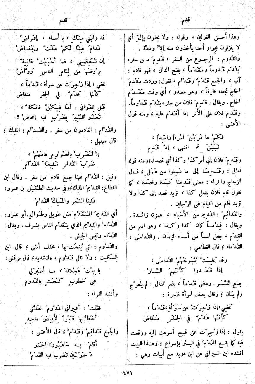 ، قَالَ الزَّجَّاجُ وَالْفَرَّاءُ: مَعْنَى قَدِمنا عَمَدنا وقصَدنا، كَمَا تَقُولُ قَامَ فُلَانٌ يَفْعَلُ كَذَا، تُرِيدُ قَصَدَ إِلى كَذَا وَلَا تُرِيدُ قَامَ مِنَ الْقِيَامِ عَلَى الرِّجلين. والقُدَائِمُ: القَدِيم مِنَ الأَشياء، هَمْزَتُهُ زَائِدَةٌ. وَيُقَالُ: قِدْماً كَانَ كَذَا وَكَذَا، وَهُوَ اسْمٌ مِنَ القِدَم، جُعِلَ اسْمًا مِنْ أَسماء الزَّمَانِ. والقُدامَى: القُدَماء، قَالَ الْقُطَامِيُّ:
