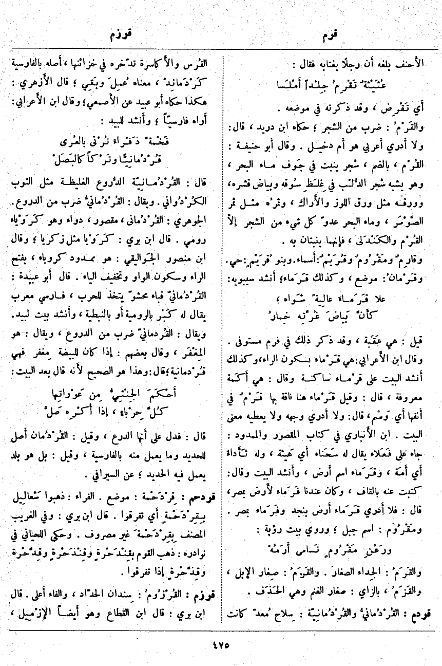 قردم: القُرْدُمانيُّ والقُرْدُمانِيَّة: سِلاح مُعدّ كَانَتِ الفُرس والأَكاسرة تَدَّخِرُهُ فِي خَزَائِنِهَا، أَصله بِالْفَارِسِيَّةِ كَرْدَمانِدْ، مَعْنَاهُ عُمِلَ وبَقِي؛ قَالَ الأَزهري: هَكَذَا حَكَاهُ أَبو عُبَيْدٍ عَنِ الأَصمعي؛ وَقَالَ ابْنُ الأَعرابي: أَراه فَارِسِيًّا؛ وأَنشد لِلَبِيدٍ: