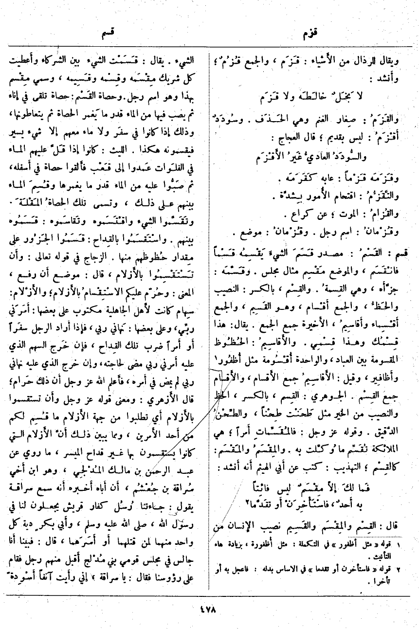 قسم: القَسْمُ: مَصْدَرُ قَسَمَ الشيءَ يَقْسِمُه قَسْماً فانْقَسَمَ، وَالْمَوْضِعُ مَقْسِم مِثَالُ مَجْلِسٍ. وقَسَّمَه: جزَّأَه، وَهِيَ القِسْمَةُ. والقِسْم، بِالْكَسْرِ: النَّصِيبُ والحَظُّ، وَالْجَمْعُ أَقْسَام، وَهُوَ القَسِيم، وَالْجَمْعُ أَقْسِماء وأَقَاسِيمُ، الأَخيرة جَمْعُ الْجَمْعِ. يُقَالُ: هَذَا قِسْمُك وَهَذَا قِسْمِي. والأَقاسِيمُ: الحُظُوظ الْمَقْسُومَةُ بَيْنَ الْعِبَادِ، وَالْوَاحِدَةُ أُقْسُومَة مِثْلُ أُظفُور «3». وأَظافِير، وَقِيلَ: الأَقَاسِيمُ جَمْعُ الأَقْسَام، والأَقْسَام جَمْعُ القِسْم. الْجَوْهَرِيُّ: القِسْم، بِالْكَسْرِ، الْحَظُّ وَالنَّصِيبُ مِنَ الْخَيْرِ مِثْلُ طَحَنْت طِحْناً، والطِّحْنُ الدَّقيق. وَقَوْلُهُ عَزَّ وَجَلَّ: فَالْمُقَسِّماتِ أَمْراً