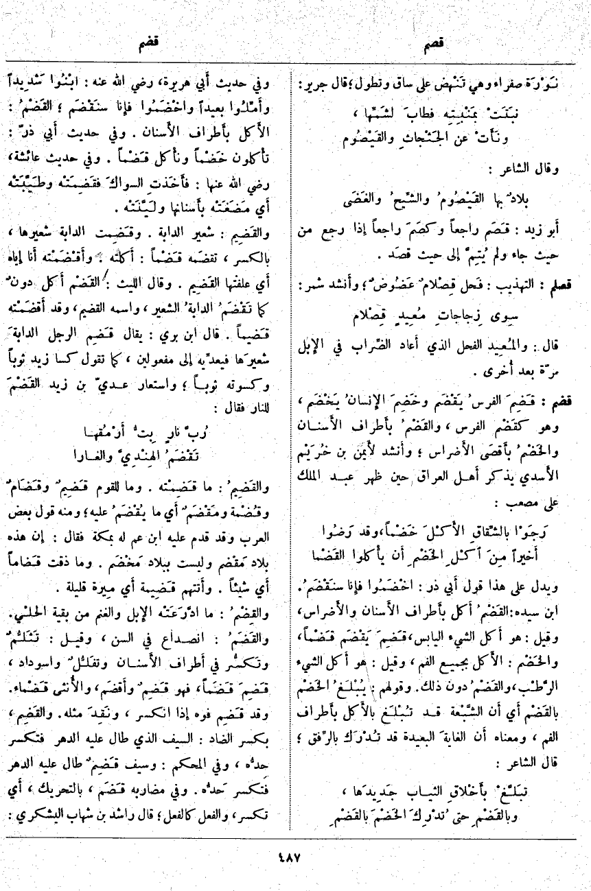 قضم: قَضِمَ الفرسُ يَقْضَمُ وخَضِمَ الإِنسانُ يَخْضَم، وَهُوَ كقَضْم الْفَرَسِ، والقَضْمُ بأَطراف الأَسنان والخَضْمُ بأَقصَى الأَضراس؛ وأَنشد لأَيمن بْنِ خُرَيْم الأَسدي يَذْكُرُ أَهْلَ الْعِرَاقِ حِينَ ظَهَرَ عَبْدُ الْمَلِكِ عَلَى مُصْعَبٍ: