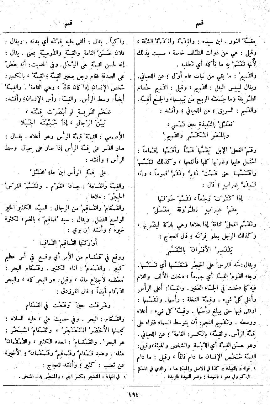 ؛ القِمَّةُ، بِالْكَسْرِ: شَخْصُ الإِنسان إِذَا كَانَ قَائِمًا، وَهِيَ القامةُ. والقِمَّةُ أَيْضًا: وَسَطُ الرأْس. والقِمَّة: رأْس الإِنسان؛ وأَنشد:
