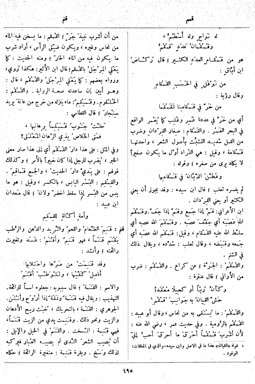 ؛ قَالَ ابْنُ الأَثير: هَكَذَا رُوي، وَرَوَاهُ بَعْضُهُمْ: كَمَا يَغْلي المِرْجَلُ القُمْقُم، قَالَ: وَهُوَ أَبين إِنْ سَاعَدَتْهُ صِحَّةُ الرِّوَايَةِ. والقُمْقُم: الحُلْقوم. وقُمَيْقِمٌ: مَاءٌ يَنْزِلُهُ مَنْ خَرَجَ مِنْ عانةَ يُرِيدُ سِنْجارَ؛ قَالَ الْقَطَّامِيُّ: