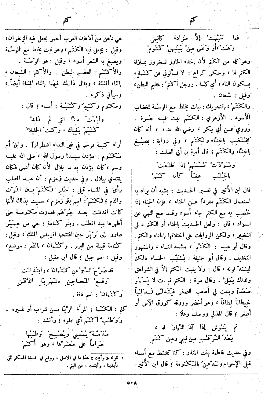 ؛ قَالَ ابْنُ الأَثير: هِيَ دُهن مِنْ أَدْهان الْعَرَبِ أَحمر يُجْعَلُ فِيهِ الزَّعْفَرَانُ، وَقِيلَ: يُجْعَلُ فِيهِ الكَتَم، وَهُوَ نَبْتٌ يُخْلَطُ مَعَ الوسْمة وَيُصْبَغُ بِهِ الشَّعْرُ أَسود، وَقِيلَ: هُوَ الوَسْمة. والأَكْثَم: الْعَظِيمُ الْبَطْنِ. والأَكثم: الشَّبْعَانُ، بِالثَّاءِ الْمُثَلَّثَةِ، وَيُقَالُ ذَلِكَ فِيهِمَا بِالتَّاءِ الْمُثَنَّاةِ أَيضاً وسيأْتي ذِكْرُهُ. ومَكْتُوم وكَتِيمٌ وكُتَيْمَة: أَسماء؛ قَالَ: