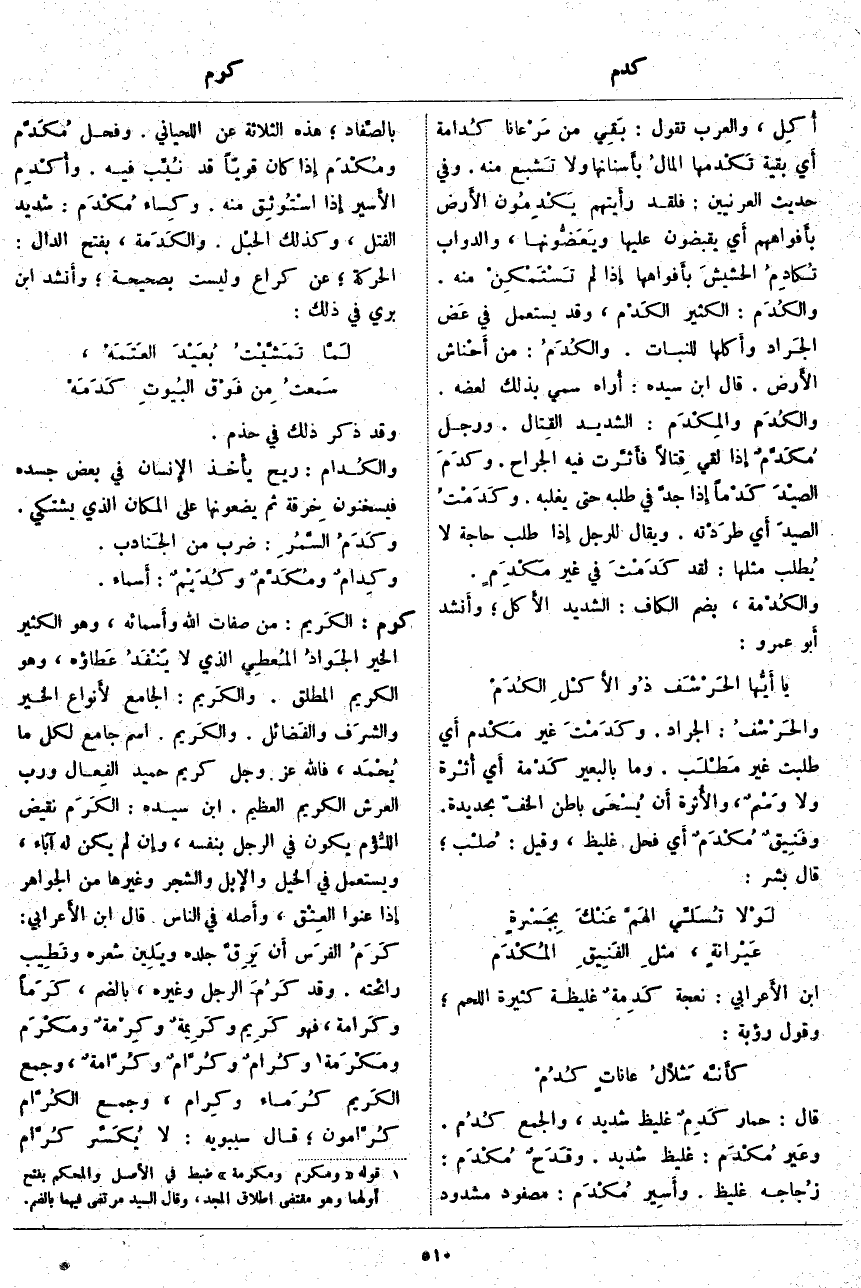 كرم: الكَريم: مِنْ صِفَاتِ اللَّهِ وأَسمائه، وَهُوَ الْكَثِيرُ الْخَيْرِ الجَوادُ المُعطِي الَّذِي لَا يَنْفَدُ عَطاؤه، وَهُوَ الْكَرِيمُ الْمُطْلَقُ. والكَرِيم: الْجَامِعُ لأَنواع الْخَيْرِ والشرَف وَالْفَضَائِلِ. والكَريم. اسْمٌ جَامِعٌ لِكُلِّ مَا يُحْمَد، فَاللَّهُ عَزَّ وَجَلَّ كَرِيمٌ حَمِيدُ الفِعال وَرَبُّ الْعَرْشِ الْكَرِيمِ الْعَظِيمِ. ابْنُ سِيدَهْ: الكَرَم نَقِيضُ اللُّؤْم يَكُونُ فِي الرَّجُلِ بِنَفْسِهِ، وَإِنْ لَمْ يَكُنْ لَهُ آبَاءٌ، وَيُسْتَعْمَلُ فِي الْخَيْلِ والإِبل وَالشَّجَرِ وَغَيْرِهَا مِنَ الْجَوَاهِرِ إِذَا عَنَوُا العِتْق، وأَصله فِي النَّاسِ قَالَ ابْنُ الأَعرابي: كَرَمُ الفرَس أَنْ يَرِقَّ جِلْدُهُ ويَلِين شَعْرُهُ وتَطِيب رَائِحَتُهُ. وَقَدْ كَرُمَ الرَّجُلُ وَغَيْرُهُ، بِالضَّمِّ، كَرَماً وكَرَامَة، فَهُوَ كَرِيم وكَرِيمَةٌ وكِرْمَةٌ ومَكْرَم ومَكْرَمَة «2». وكُرَامٌ وكُرَّامٌ وكُرَّامَةٌ، وَجَمْعُ الكَرِيم كُرَماء وكِرام، وَجَمْعُ الكُرَّام كُرَّامون؛ قَالَ سِيبَوَيْهِ: لَا يُكَسَّر كُرَّام