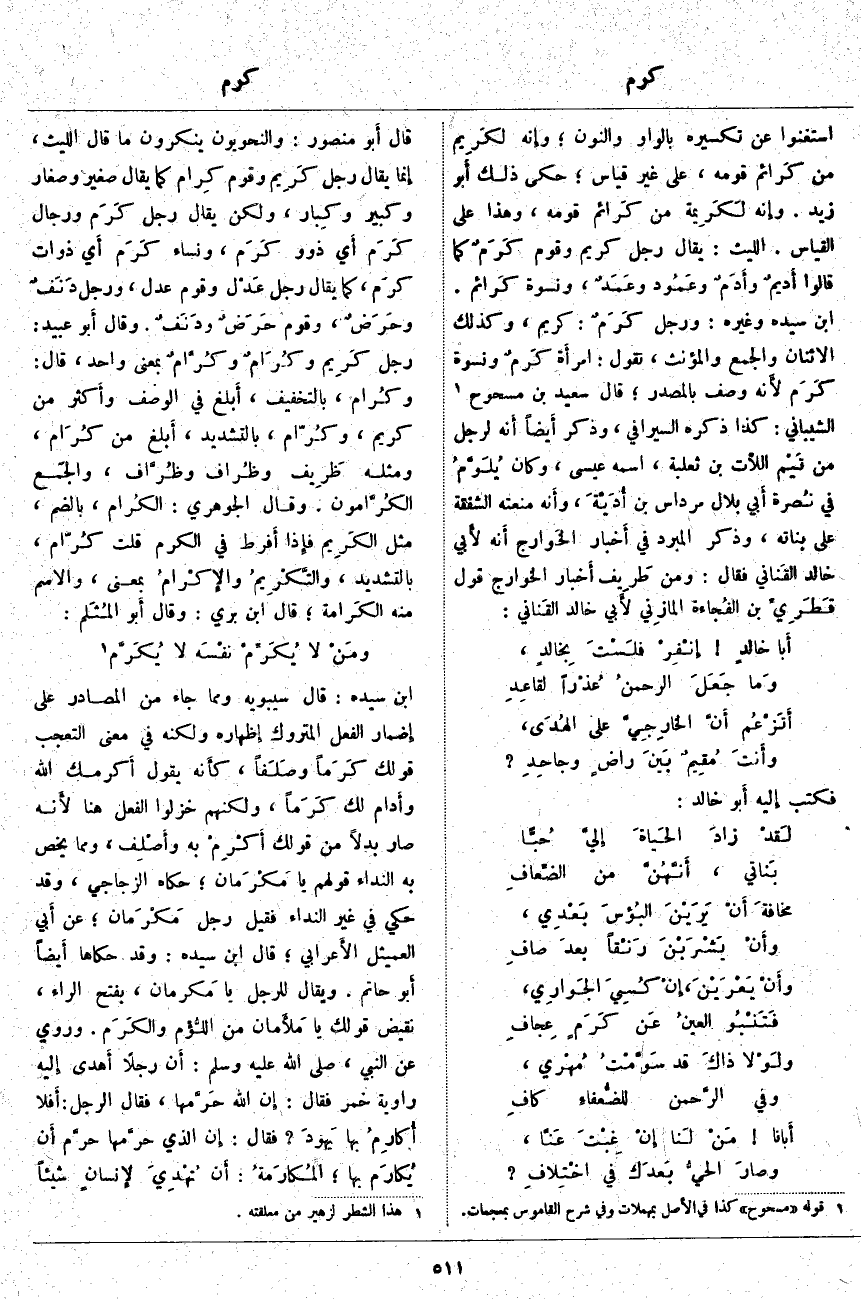 اسْتَغْنَوْا عَنْ تَكْسِيرِهِ بِالْوَاوِ وَالنُّونِ؛ وَإِنَّهُ لكَرِيم مِنْ كَرَائِم قَوْمِهِ، عَلَى غَيْرِ قياس؛ حكى ذَلِكَ أَبو زَيْدٍ. وَإِنَّهُ لَكَرِيمة مِنْ كَرائم قَوْمِهِ، وَهَذَا عَلَى الْقِيَاسِ. اللَّيْثُ: يُقَالُ رَجُلٌ كَرِيم وَقَوْمٌ كَرَمٌ كَمَا قَالُوا أَديمٌ وأَدَمٌ وعَمُود وعَمَدٌ، وَنِسْوَةٌ كَرَائِم. ابْنُ سِيدَهْ وَغَيْرُهُ: وَرَجُلٌ كَرَمٌ: كَرِيمٌ، وَكَذَلِكَ الِاثْنَانِ وَالْجَمْعُ وَالْمُؤَنَّثُ، تَقُولُ: امرأَة كَرمٌ وَنِسْوَةٌ كَرَمٌ لأَنه وَصْفٌ بِالْمَصْدَرِ؛ قَالَ سَعِيدُ بْنُ مَسْحُوحٍ «1» الشَّيْبَانِيُّ: كَذَا ذَكَرَهُ السِّيرَافِيُّ، وَذَكَرَ أَيضاً أَنَّهُ لِرَجُلٍ مِنْ تَيْم اللَّاتِ بْنِ ثَعْلَبَةَ، اسْمُهُ عِيسَى، وَكَانَ يُلَوَّمُ فِي نُصرة أَبي بِلَالٍ مِرْدَاسِ بْنِ أُدَيَّةَ، وأَنه مَنَعَتْهُ الشَّفَقَةُ عَلَى بَنَاتِهِ، وَذَكَرَ الْمُبَرِّدُ فِي أَخبار الْخَوَارِجِ أَنه لأَبي خَالِدٍ القَناني فَقَالَ: وَمِنْ طَريف أَخبار الْخَوَارِجِ قَوْلُ قَطَرِيِّ بْنِ الفُجاءة المازِني لأَبي خَالِدٍ القَناني: