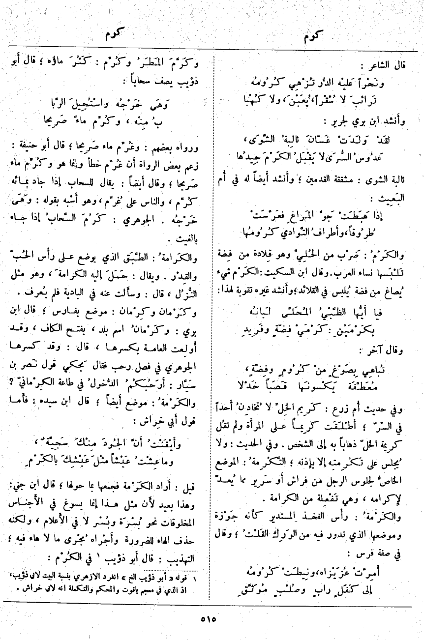 قِيلَ: أَراد الكَرْمة فَجَمَعَهَا بِمَا حَوْلَهَا؛ قَالَ ابْنُ جِنِّي: وَهَذَا بَعِيدٌ لأَن مِثْلَ هَذَا إِنَّمَا يُسَوَّغُ فِي الأَجناس الْمَخْلُوقَاتِ نَحْوَ بُسْرَة وبُسْر لَا فِي الأَعلام، وَلَكِنَّهُ حَذَفَ الْهَاءَ لِلضَّرُورَةِ وأَجْراه مُجْرى مَا لَا هَاءَ فِيهِ؛ التَّهْذِيبُ: قَالَ أَبو ذُؤَيْبٍ «3» فِي الكُرْم: