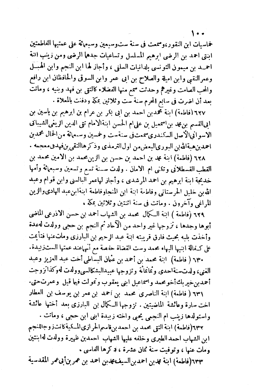 630 - (فَاطِمَة) ابْنة مُحَمَّد بن احْمَد بن عُثْمَان الْبِسَاطِيّ أُخْت عبد الْعَزِيز وَعبد الْغَنِيّ، ولدت سنة احدى وَثَمَانمِائَة وَتَزَوجهَا عبيد البشكالسي وَولدت لَهُ وَكَذَا تزوجت أَحْمد بن خير بك أَخُو مُحَمَّد واسماعيل ابْني يَعْقُوب وتمولت فِيمَا قيل وعمرت حَتَّى