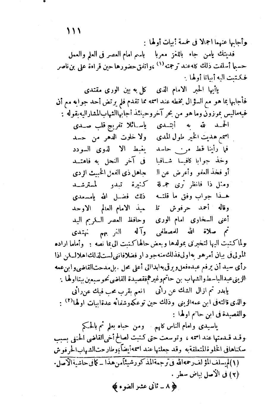 (فديتك يَا من جَاءَ باللغز معريا ... باسم امام الْعَصْر فِي الْعلم وَالْعَمَل)