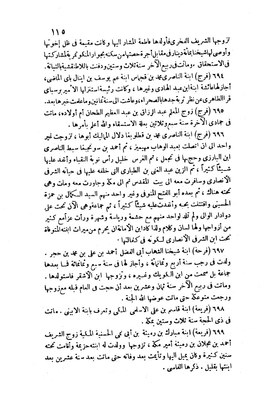 699 - (فريعة) ابْنة مبارك بن رميثة بن ابي نمى الحسنية المكية زوج الشريف أَحْمد بن عجلَان بن رميثة أَمِير مَكَّة، تزَوجهَا وَولدت لَهُ ابْنَته حزيمة وأقامت تَحْتَهُ سِنِين كَثِيرَة وَكَانَ يمِيل اليها وتأيمت بعد وَفَاته حَتَّى مَاتَت بعد سنة عشْرين بعد ابْنَتهَا بِقَلِيل. ذكرهَا الفاسي