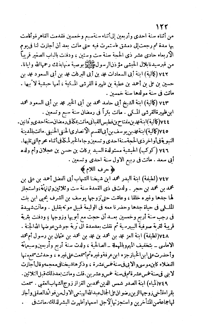 747 - (لَطِيفَة) ابْنة الْبَدْر مُحَمَّد ابْن شَيخنَا الشهَاب أبي الْفضل أَحْمد بن عَليّ بن مُحَمَّد بن مُحَمَّد بن حجر. ولدت فِي ذِي الْقعدَة سنة سِتّ وَثَلَاثِينَ وَثَمَانمِائَة، واستجاز لَهَا جدها وَغَيره خلقا، وَعَاشَتْ حَتَّى تزَوجهَا يُوسُف بن الشّرف يحيى ابْن بنت الملكي فِي حَيَاة جدها وحضرنا مَعَه فِي الْوَلِيمَة قبيل مَوته بِقَلِيل. وَمَات شهيدة فِي رَجَب سنة أَربع وَخمسين بعد أَن حجت مَعَ أَبَوَيْهَا وَزوجهَا؛ ودفنت بتربة قريبَة لتربة صوفية البيبرسية ثمَّ نقلت بعد مُدَّة الى تربة جوشن عوضهَا الله الْجنَّة