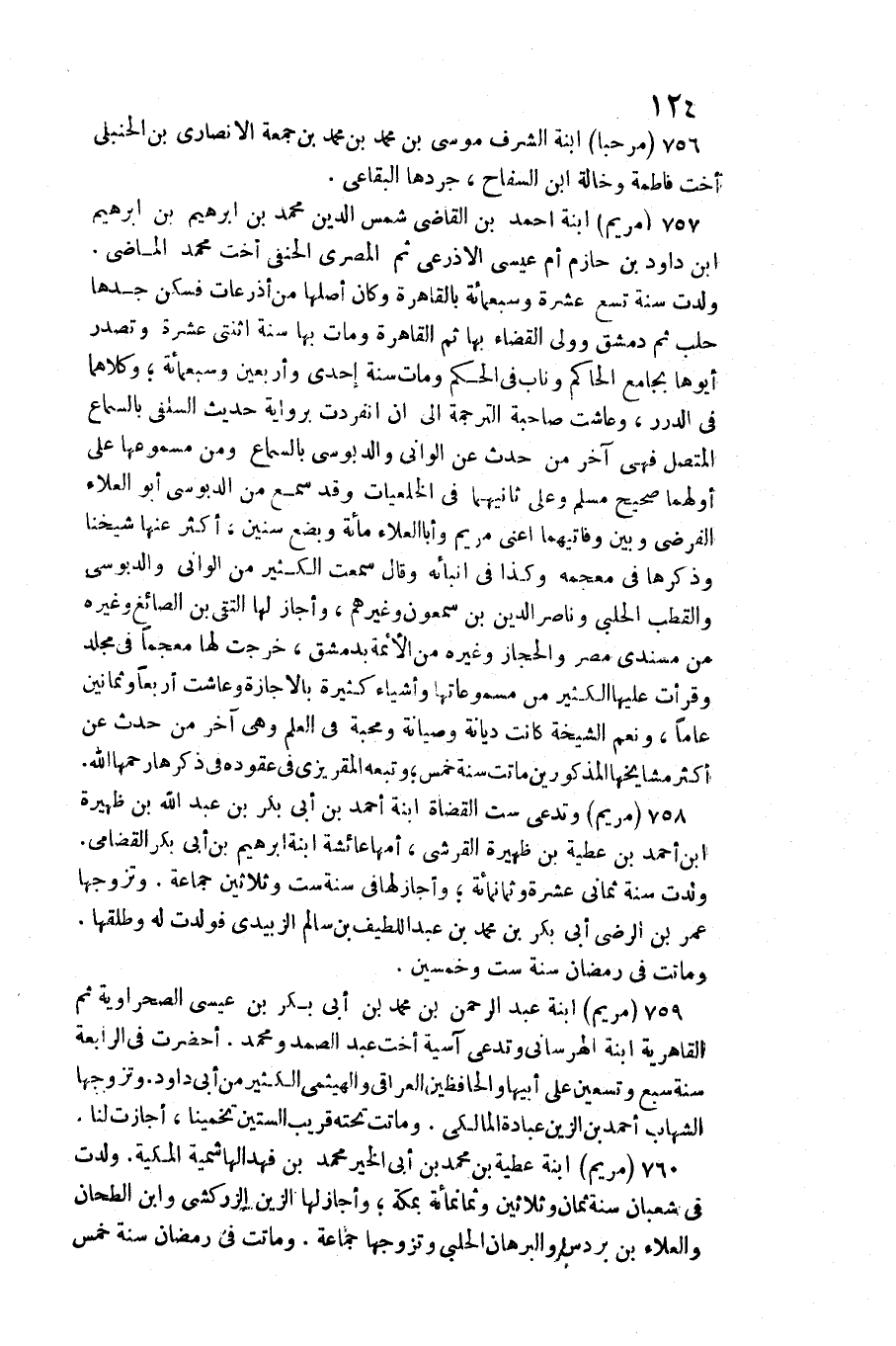 759 - (مَرْيَم) ابْنة عبد الرَّحْمَن بن مُحَمَّد بن أبي بكر بن عِيسَى الصحراوية ثمَّ القاهرية ابْنة الهرساني وتدعى آسِيَة أُخْت عبد الصَّمد وَمُحَمّد. أحضرت فِي الرَّابِعَة سنة سبع وَتِسْعين على أَبِيهَا والحافظين الْعِرَاقِيّ والهيثمي الْكثير من أبي دَاوُد. وَتَزَوجهَا الشهَاب أَحْمد بن الزين عبَادَة الْمَالِكِي. وَمَاتَتْ تَحْتَهُ قريب السِّتين تخمينا، أجازت لنا