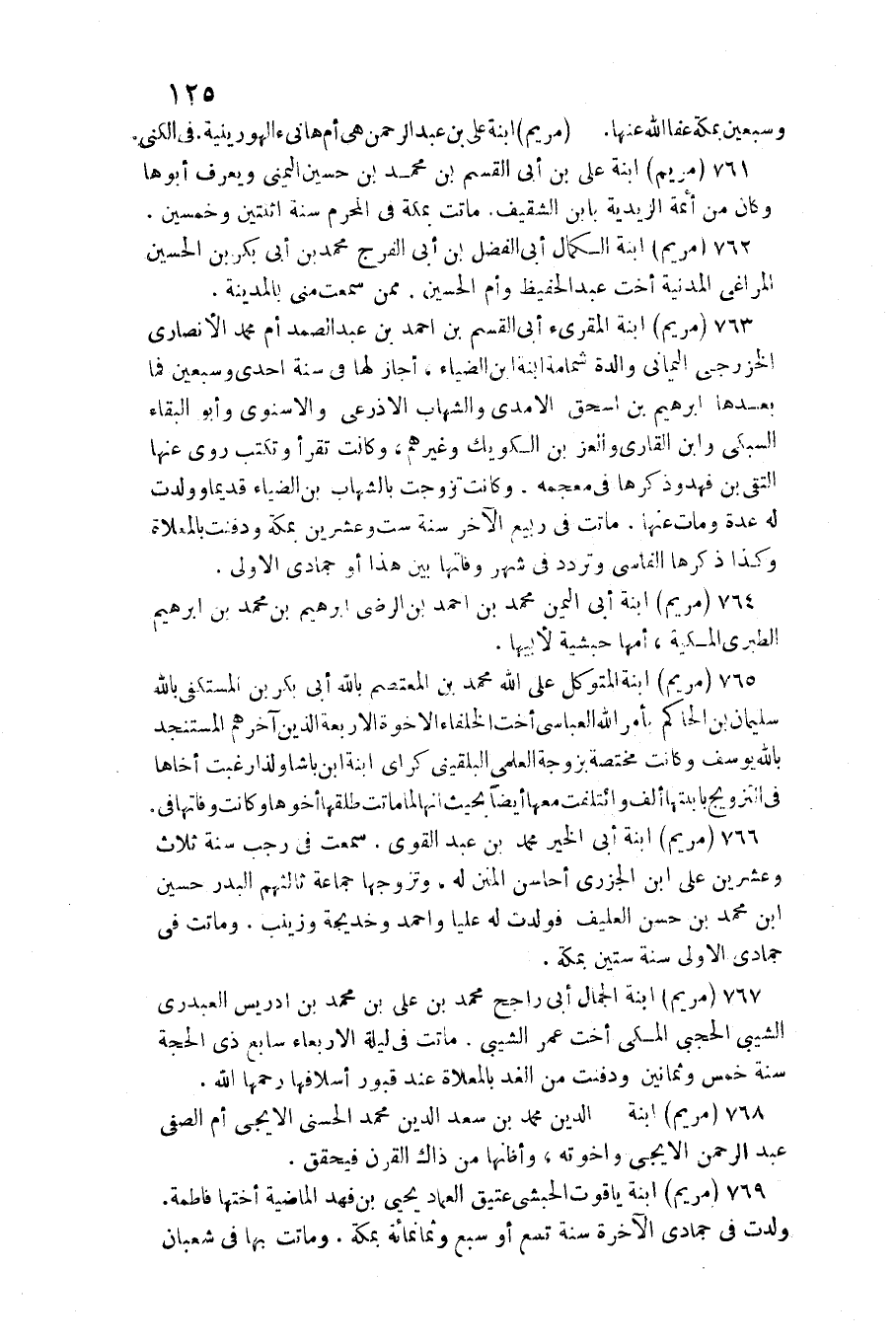 765 - (مَرْيَم) ابْنة المتَوَكل على الله مُحَمَّد بن المعتصم بِاللَّه أبي بكر بن المستكفى بِاللَّه سُلَيْمَان بن الْحَاكِم بِأَمْر الله العباسي أُخْت الْخُلَفَاء الاخوة الاربعة الَّذين آخِرهم المستنجد بِاللَّه يُوسُف وَكَانَت مُخْتَصَّة بِزَوْجَة العلمى البلقينى كراى ابْنة ابْن باشا وَلذَا رغبت أخاها فِي التَّزْوِيج بابنتها ألف وائتلفت مَعهَا أَيْضا بِحَيْثُ انها لما مَاتَت طَلقهَا أَخُوهَا وَكَانَت وفاتها فِي