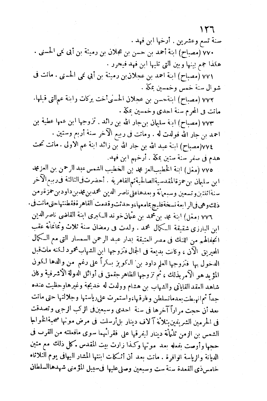 774 - (مِصْبَاح) ابْنة عبد الله بن جَار الله بن زَائِد ابْنة عَم الاولى. مَاتَت تَحت هدم فِي صفر سنة سِتِّينَ بِمَكَّة. أرخهم ابْن فَهد