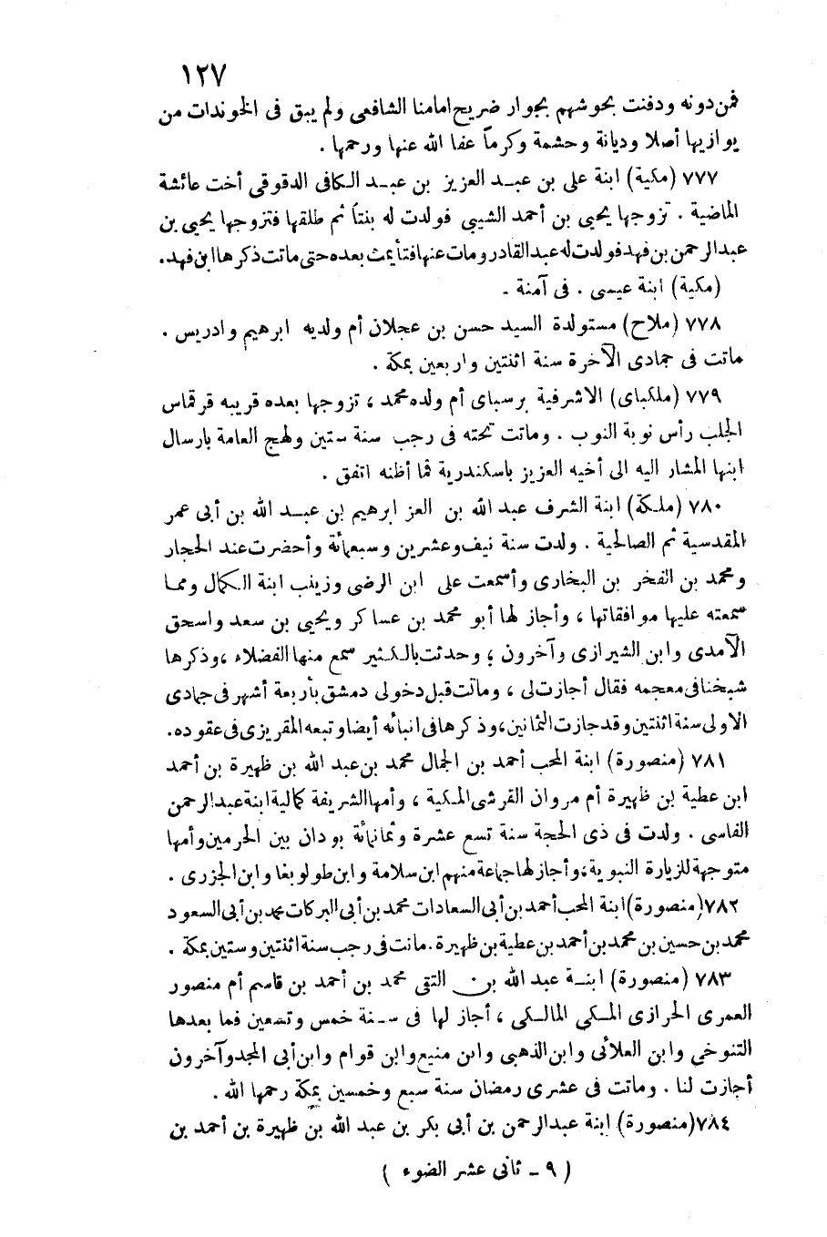 783 - (منصورة) ابْنة عبد الله بن التقي مُحَمَّد بن أَحْمد بن قَاسم أم مَنْصُور الْعمريّ الحرازى الْمَكِّيّ الْمَالِكِي، أجَاز لَهَا فِي سنة خمس وَتِسْعين فَمَا بعْدهَا التنوخى وَابْن العلائي وَابْن الذَّهَبِيّ وَابْن منيع وَابْن قوام وَابْن أبي الْمجد وَآخَرُونَ أجازت لنا. وَمَاتَتْ فِي عشرى رَمَضَان سنة سبع وَخمسين بِمَكَّة رَحمهَا الله