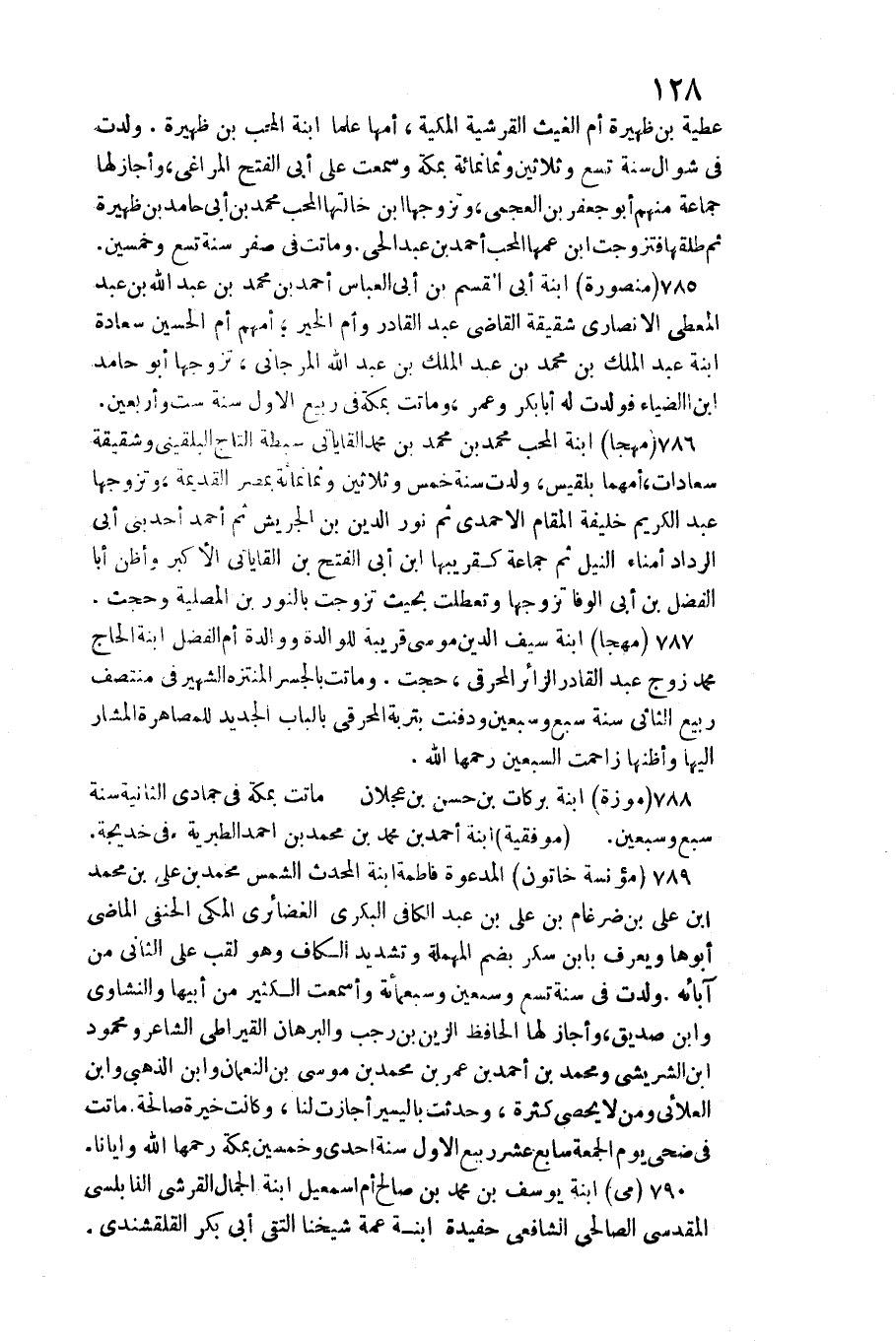 788 - (موزة) ابْنة بَرَكَات بن حسن بن عجلَان مَاتَت بِمَكَّة فِي جُمَادَى الثَّانِيَة سنة سبع وَسبعين. (موفقية) ابْنة أَحْمد بن مُحَمَّد بن مُحَمَّد بن أَحْمد الطبرية فِي خَدِيجَة