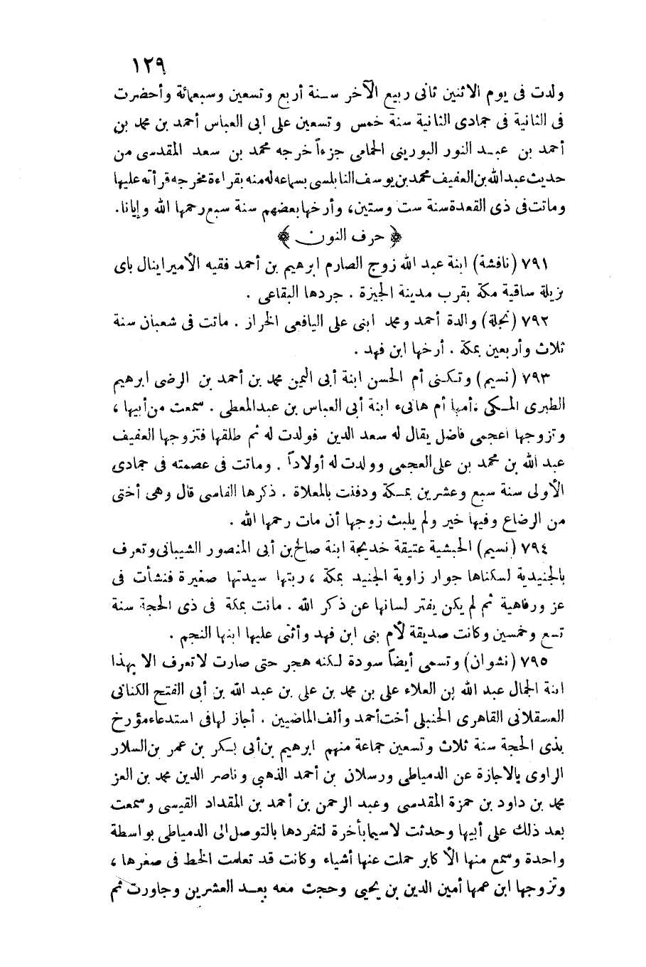 793 - (نسيم) وتكنى أم الْحسن ابْنة أبي الْيمن مُحَمَّد بن أَحْمد بن الرضى ابراهيم الطَّبَرِيّ الْمَكِّيّ، أمهَا ام هَانِئ ابْنة أبي الْعَبَّاس بن عبد الْمُعْطِي. سَمِعت من أَبِيهَا، وَتَزَوجهَا اعجمي فَاضل يُقَال لَهُ سعد الدّين فَولدت لَهُ ثمَّ طَلقهَا فَتَزَوجهَا الْعَفِيف عبد الله بن مُحَمَّد بن عَليّ العجمي وَولدت لَهُ أَوْلَادًا. وَمَاتَتْ فِي عصمته فِي جُمَادَى الأولى سنة سبع وَعشْرين بِمَكَّة ودفنت بالمعلاة. ذكهرا الفاسي قَالَ وَهِي أُخْتِي من الرَّضَاع وفيهَا خير وَلم يلبث زَوجهَا أَن مَاتَ رَحمهَا الله
