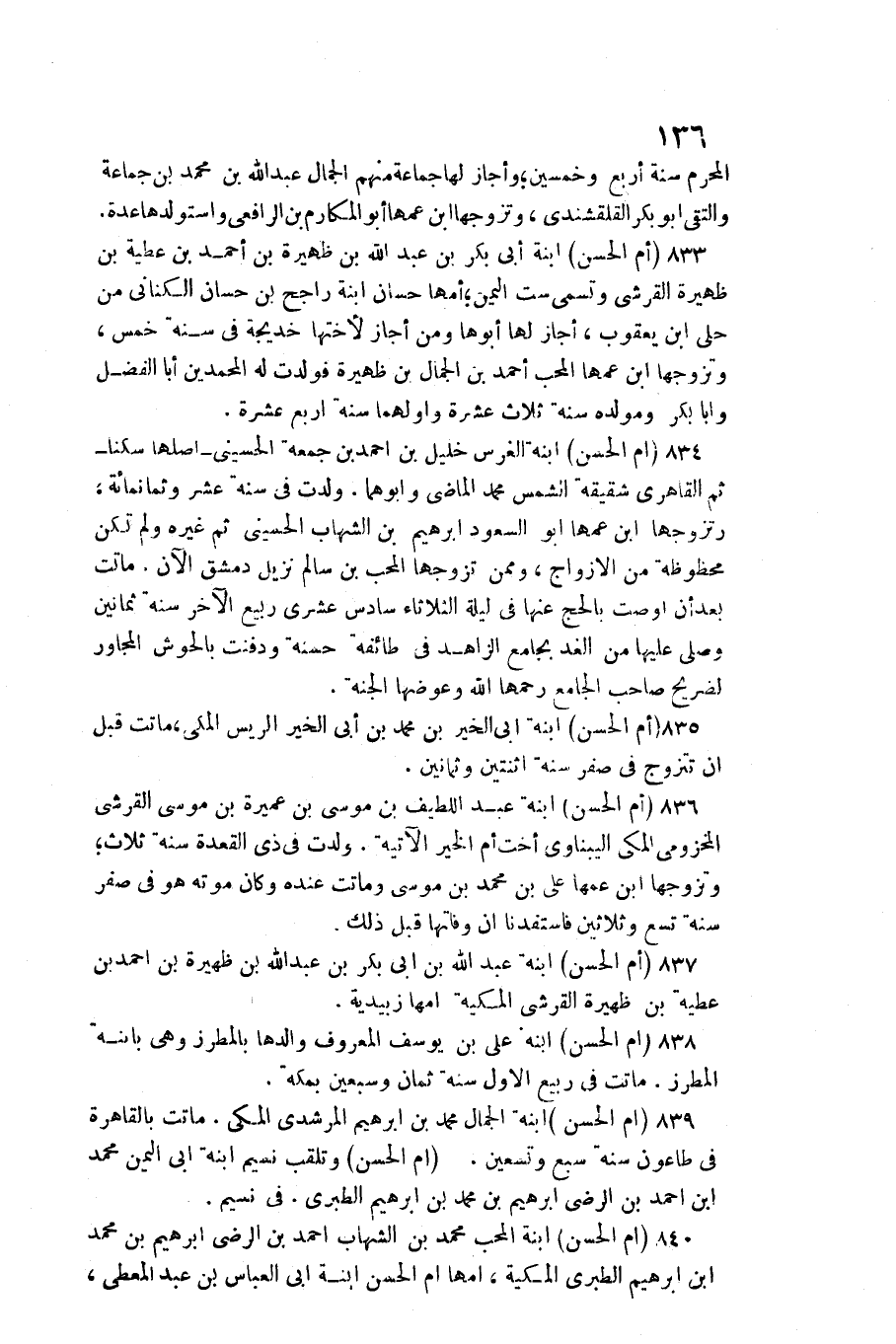 836 - (أم الْحسن) ابْنة عبد اللَّطِيف بن مُوسَى بن عميرَة بن مُوسَى الْقرشِي المَخْزُومِي الْمَكِّيّ اليبناوي أُخْت أم الْخَيْر الْآتِيَة. ولدت فِي ذِي الْقعدَة سنة ثَلَاث، وَتَزَوجهَا ابْن عَمها عَليّ بن مُحَمَّد بن مُوسَى وَمَاتَتْ عِنْده وَكَانَ مَوته هُوَ فِي صفر سنة تسع وَثَلَاثِينَ فاستفدنا ان وفاتها قبل ذَلِك