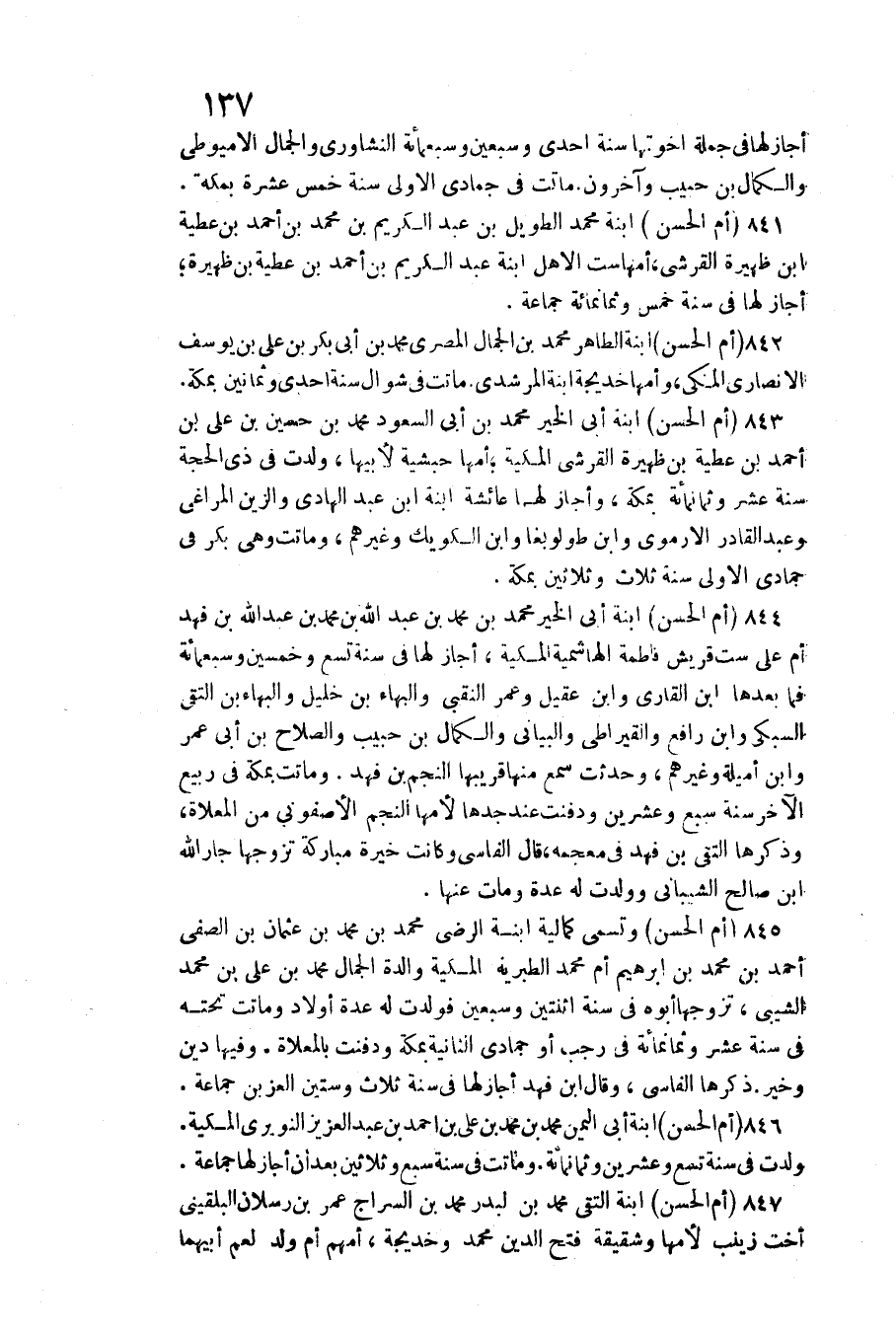 843 - (أم الْحسن) ابْنة ابي الْخَيْر مُحَمَّد بن أبي السُّعُود مُحَمَّد بن حُسَيْن بن عَليّ بن أَحْمد بن عَطِيَّة بن ظهيرة الْقرشِي المكية، أمهَا حبشية لأَبِيهَا، ولدت فِي ذِي الْحجَّة سنة عشر وَثَمَانمِائَة بِمَكَّة، وَأَجَازَ لَهما عَائِشَة ابْنة ابْن عبد الْهَادِي والزين المراغي وَعبد الْقَادِر الارموى وَابْن طولوبغا وَابْن الكويك وَغَيرهم، وَمَاتَتْ وَهِي بكر فِي جُمَادَى الاولى سنة ثَلَاث وَثَلَاثِينَ بِمَكَّة