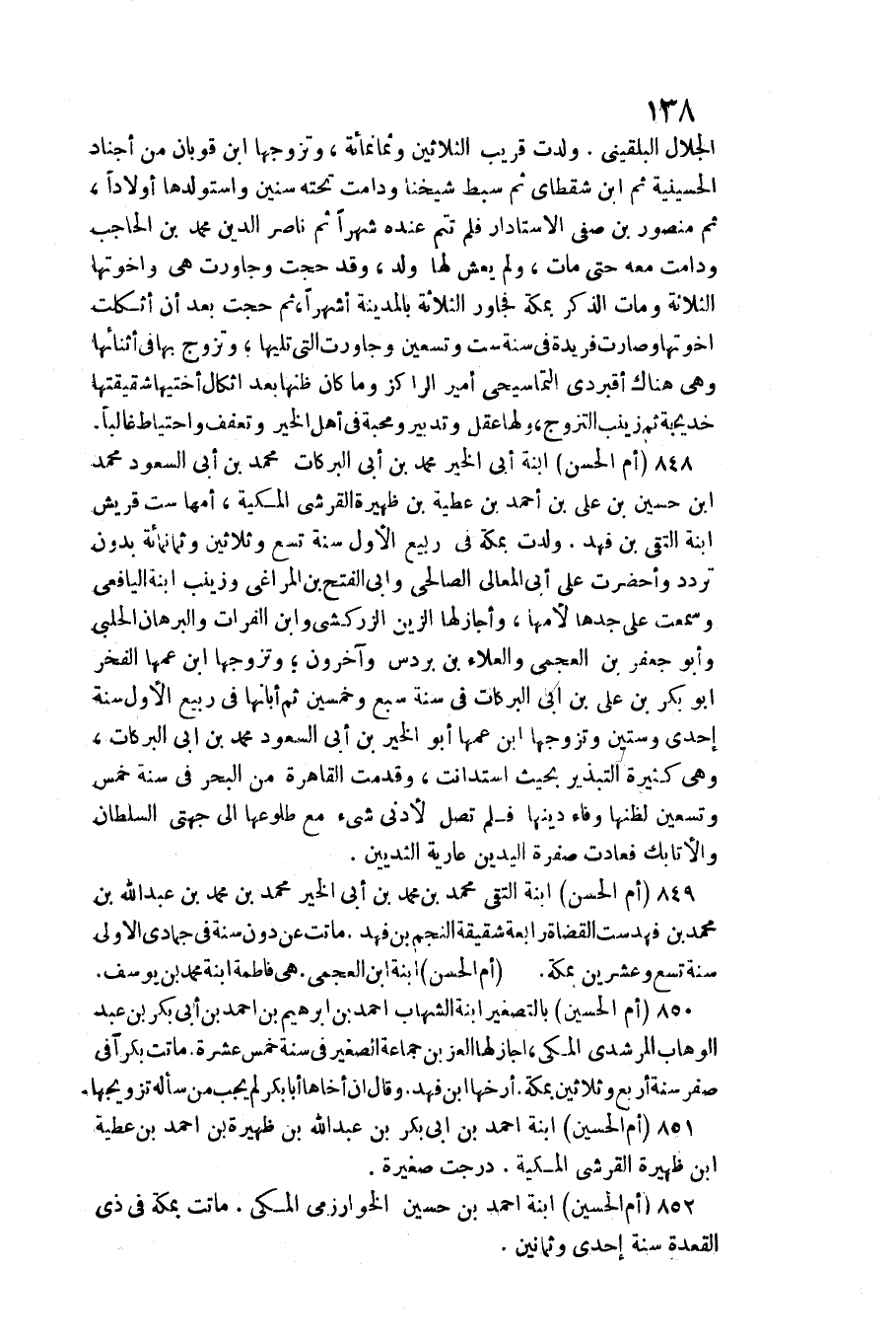 848 - (أم الْحسن) ابْنة أبي الْخَيْر مُحَمَّد بن أبي البركات مُحَمَّد بن أبي السُّعُود مُحَمَّد ابْن حُسَيْن بن عَليّ بن احْمَد بن عَطِيَّة بن ظهيرة الْقرشِي المكية، أمهَا سِتّ قُرَيْش ابْنة التقي بن فَهد. ولدت بِمَكَّة فِي ربيع الأول سنة تسع وَثَلَاثِينَ وَثَمَانمِائَة بِدُونِ تردد وأحضرت على أبي الْمَعَالِي الصَّالِحِي وابي الْفَتْح بن المراغي وَزَيْنَب ابْنة اليافعي وَسمعت على جدها لأمها، وَأَجَازَ لَهَا الزين الزَّرْكَشِيّ وَابْن الْفُرَات والبرهان الْحلَبِي وَأَبُو جَعْفَر بن العجمي والْعَلَاء بن بردس وَآخَرُونَ؛ وَتَزَوجهَا ابْن عَمها الْفَخر ابو بكر بن عَليّ بن ابي البركات فِي سنة سبع وَخمسين ثمَّ أَبَانهَا فِي ربيع الأول سنة إِحْدَى وَسِتِّينَ وَتَزَوجهَا ابْن عَمها أَبُو الْخَيْر بن أبي السُّعُود مُحَمَّد بن أبي البركات، وَهِي كَثِيرَة التبذير بِحَيْثُ استدانت، وقدمت الْقَاهِرَة من الْبَحْر فِي سنة خمس وَتِسْعين لظنها وَفَاء دينهَا فَلم تصل لأدنى شَيْء مَعَ طُلُوعهَا الى جهتى السُّلْطَان والأتابك فَعَادَت صفرَة الْيَدَيْنِ عَارِية الثديين
