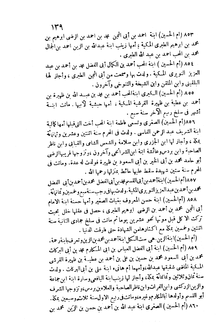 853 - (أم الْحُسَيْن) ابْنة أَحْمد بن أبي الْيمن مُحَمَّد بن احْمَد بن الرضى ابراهيم بن مُحَمَّد بن ابراهيم الطَّبَرِيّ المكية؛ أمهَا زَيْنَب ابْنة عبد الله بن الزين احْمَد بن الْجمال مُحَمَّد بن الْمُحب احْمَد بن عبد الله الطبرى