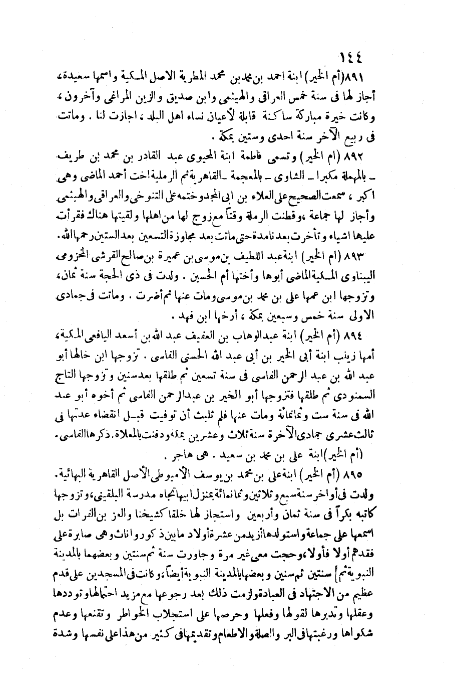 ? 895 (أم الْخَيْر) ابْنة عَليّ بن مُحَمَّد بن يُوسُف الأميوطي الأَصْل القاهرية البهائية. ولدت فِي أَوَاخِر سنة سبع وَثَلَاثِينَ وَثَمَانمِائَة بمنزل أَبِيهَا تجاه مدرسة البُلْقِينِيّ، وَتَزَوجهَا كَاتبه بكرا فِي سنة ثَمَان وَأَرْبَعين واستجاز لَهَا خلقا كشيخنا والعز بن الْفُرَات بل أسمعها على جمَاعَة وأستولدها أَزِيد من عشرَة أَوْلَاد مَا بَين ذُكُور وإناث وَهِي صابرة على فقدهم أَولا فأولا، وحجت معي غير مرّة وجاورت سنة ثمَّ سنتَيْن وبعضهما بِالْمَدِينَةِ النَّبَوِيَّة ثمَّ سنتَيْن ثمَّ سِنِين وَبَعضهَا بِالْمَدِينَةِ النَّبَوِيَّة أَيْضا، وَكَانَت فِي المسجدين على قدم عَظِيم من الِاجْتِهَاد فِي الْعِبَادَة ولزمت ذَلِك بعد رُجُوعهَا مَعَ مزِيد احتمالها وتوددها وعقلها وتدبرها لقولها وفعلها وحرصها على استجلاب الخواطر وتقنعها وَعدم شكواها ورغبتها فِي الْبر والصلة وَالْإِطْعَام وتقديمها فِي كثير من هَذَا على نَفسهَا وَشدَّة