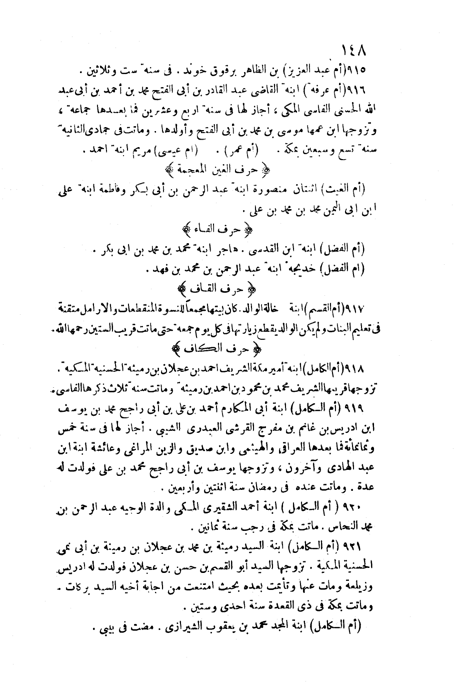 918 - (أم الْكَامِل) ابْنة أَمِير مَكَّة الشريف احْمَد بن عجلَان بن رميثة الحنسية المكية تزَوجهَا قريبها الشريف مُحَمَّد بن مَحْمُود بن احْمَد بن رميثة وَمَاتَتْ سنة ثَلَاث ذكرهَا الفاسي