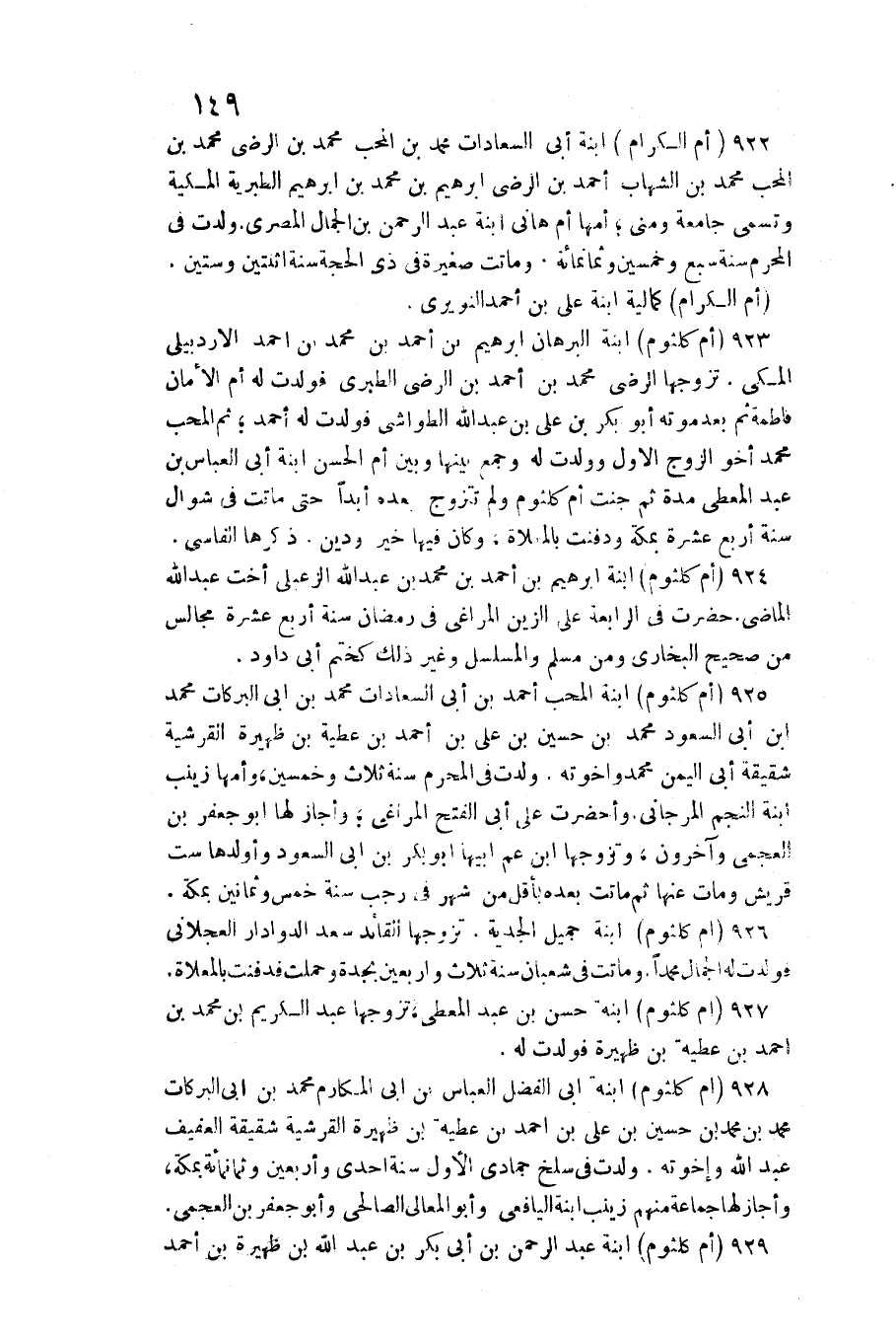 929 - (أم كُلْثُوم) ابْنة عبد الرَّحْمَن بن أبي بكر بن عبد الله بن ظهيرة بن أَحْمد.