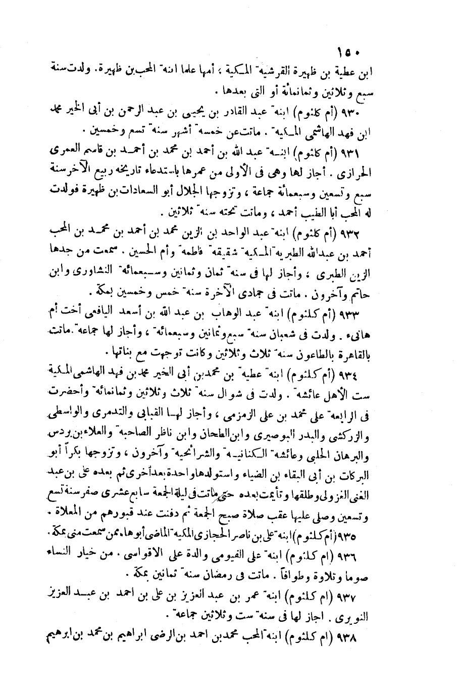 930 - (أم كُلْثُوم) ابْنة عبد الْقَادِر بن يحيى بن عبد الرَّحْمَن بن أبي الْخَيْر مُحَمَّد ابْن فَهد الْهَاشِمِي المكية. مَاتَت عَن خَمْسَة أشهر سنة تسع وَخمسين