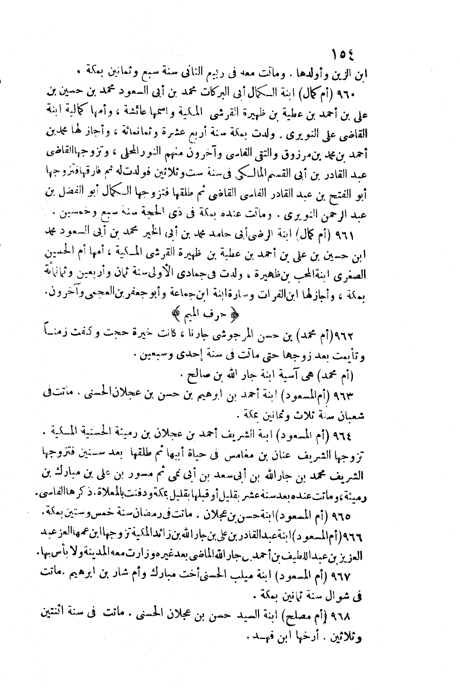 96 - (أم مُحَمَّد) بن حسن المرجوشي جارنا، كَانَت خيرة حجت وكفت زَمنا وتأيمت بعد زَوجهَا حَتَّى مَاتَت فِي سنة إِحْدَى وَسبعين. (أم مُحَمَّد) هِيَ آسِيَة ابْنة جَار الله بن صَالح. 963 (أم المسعود) ابْنة أَحْمد بن إِبْرَاهِيم بن حسن بن عجلَان الحسني. مَاتَت فِي شعْبَان سنة ثَلَاث وَثَمَانِينَ بِمَكَّة. 964 (أم المسعود) ابْنة الشريف أَحْمد بن عجلَان بن رميثة الحسنية المكية. تزَوجهَا الشريف عنان بن مغامس فِي حَيَاة أَبِيهَا ثمَّ طَلقهَا بعد سِنِين فَتَزَوجهَا الشريف مُحَمَّد بن جَار الله بن أبي سعد بن أبي نمي ثمَّ مسور بن عَليّ بن مبارك بن رميثة، وَمَاتَتْ عِنْده بعد سنة عشر بِقَلِيل أَو قبلهَا بِقَلِيل بِمَكَّة ودفنت بالمعلاة. ذكرهَا القاسي