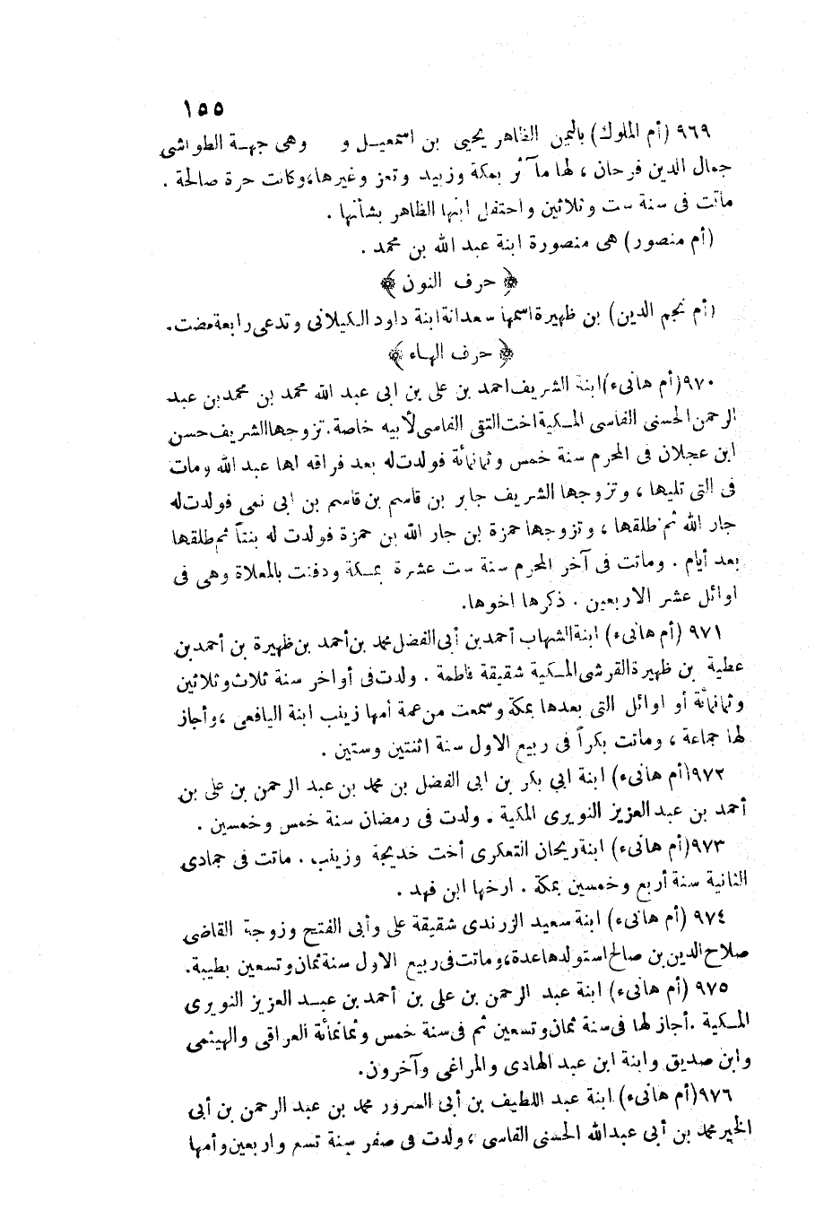 975 - (أم هَانِئ) ابْنة عبد الرَّحْمَن بن عَليّ بن أَحْمد بن عبد الْعَزِيز النويري المكية. أجَاز لَهَا فِي سنة ثَمَان وَتِسْعين ثمَّ فِي سنة خمس وَثَمَانمِائَة الْعِرَاقِيّ والهيثمي وَابْن صديق وَابْنَة ابْن عبد الْهَادِي والمراغي وَآخَرُونَ. 976 (أم هَانِئ) ابْنة عبد اللَّطِيف بن أبي السرُور مُحَمَّد بن عبد الرَّحْمَن بن أبي الْخَيْر مُحَمَّد بن أبي عبد الله الحسني الفاسي، ولدت فِي صفر سنة تسع وَأَرْبَعين وَأمّهَا