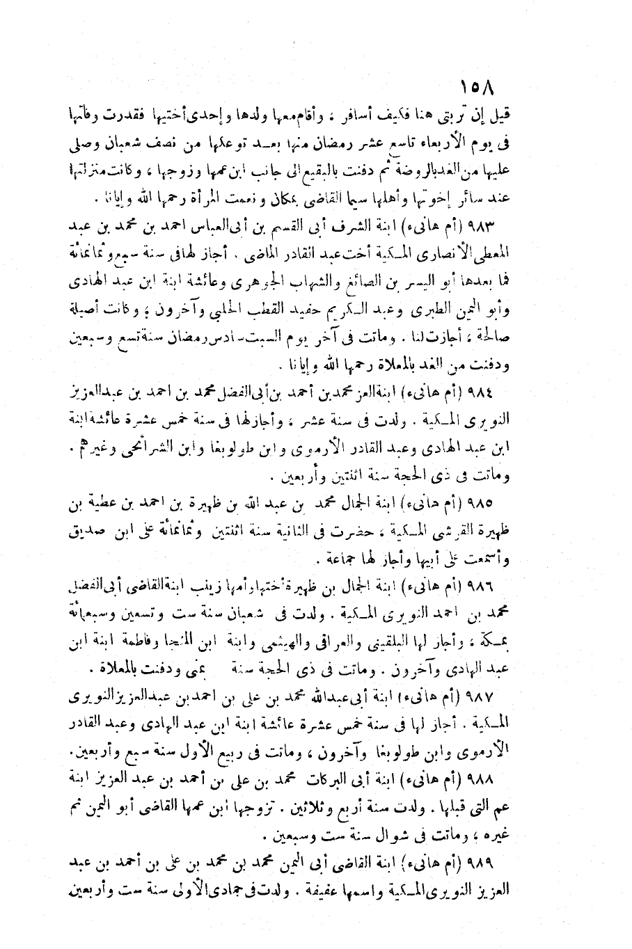 983 - (أم هَانِئ) ابْنة الشّرف أبي الْقسم بن أبي الْعَبَّاس أَحْمد بن مُحَمَّد بن عبد الْمُعْطِي الْأنْصَارِيّ المكية أُخْت عبد الْقَادِر الْمَاضِي. أجَاز لَهَا فِي سنة سبع وَثَمَانمِائَة فَمَا بعْدهَا أَبُو الْيُسْر بن الصَّائِغ والشهاب الْجَوْهَرِي وَعَائِشَة ابْنة ابْن عبد الْهَادِي وَأَبُو الْيمن الطَّبَرِيّ وَعبد الْكَرِيم حفيد القطب الْحلَبِي وَآخَرُونَ؛ وَكَانَت أصيلة صَالِحَة، أجازت لنا. وَمَاتَتْ فِي آخر يَوْم السبت سادس رَمَضَان سنة تسع وَسبعين ودفنت من الْغَد بالمعلاة رَحمهَا الله وإيانا