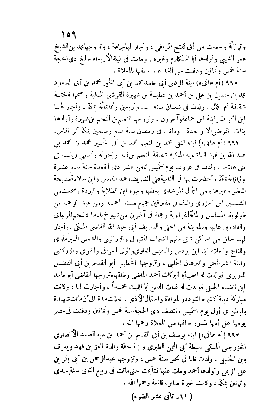 990 - (أم هَانِئ) ابْنة الرضي أبي حَامِد مُحَمَّد بن أبي الْخَيْر مُحَمَّد بن أبي السُّعُود مُحَمَّد بن حُسَيْن بن عَليّ بن أَحْمد بن عَطِيَّة بن ظهيرة الْقرشِي المكية وَاسْمهَا فَاخِتَة شَقِيقَة أم كَمَال. ولدت فِي شعْبَان سنة سِتّ وَأَرْبَعين وَثَمَانمِائَة بِمَكَّة، وَأَجَازَ لَهَا ابْن الْفُرَات وَابْنه ابْن جمَاعَة وَآخَرُونَ؛ وَتَزَوجهَا النَّجْم بن النَّجْم بن ظهيرة وأولدها بَنَات انقرضن إِلَّا وَاحِدَة. وَمَاتَتْ فِي رَمَضَان سنة تسع وَسبعين بِمَكَّة أثر نِفَاس