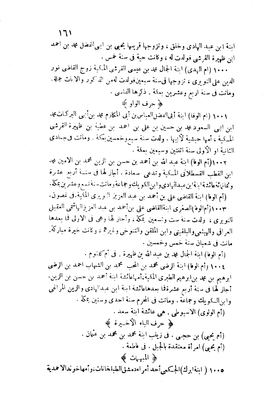 1000 - (أم الْهدى) ابْنة الْجمال مُحَمَّد بن عِيسَى الْقرشِي المكية زوج القَاضِي نور الدّين عَليّ النويري، تزَوجهَا فِي سنة سبعين فَولدت لَهُ من الذُّكُور وَالْإِنَاث جملَة. وَمَاتَتْ فِي سنة أَربع وَعشْرين بِمَكَّة. ذكرهَا الفاسي
