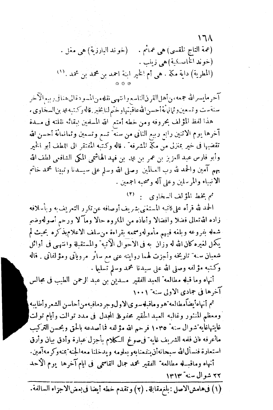 هَذَا لفظ الْمُؤلف بِحُرُوفِهِ وَمن خطه أمتع الله الْمُسلمين بِبَقَائِهِ نقلته فِي مُدَّة آخرهَا يَوْم الِاثْنَيْنِ رَابِع ربيع الثَّانِي من سنة تسع وَتِسْعين وَثَمَانمِائَة أحسن الله تقضيها فِي خير بمنزلي من مَكَّة المشرفة. قَالَه وَكتبه المفتقر الى اللطف أَبُو الْخَيْر وَأَبُو فَارس عبد الْعَزِيز بن عمر بن مُحَمَّد بن فَهد الْهَاشِمِي الْمَكِّيّ الشَّافِعِي لطف الله بهم آمين وَالْحَمْد لله رب الْعَالمين وَصلى الله وَسلم على سيدنَا وَنَبِينَا مُحَمَّد خَاتم الْأَنْبِيَاء وَالْمُرْسلِينَ وعَلى آله وَصَحبه أَجْمَعِينَ. ثمَّ بِخَط الْمُؤلف السخاوي: الْحَمد لله قَرَأَهُ على كَاتبه المستغني بشريف أَوْصَافه عَن تكَرر التَّعْرِيف بِهِ وبأسلافه زَاده الله تَعَالَى فضلا وأفضالا وأعاذه من الْمَكْرُوه حَالا ومآلا ورحم أُصُوله وَضم شَمله بفروعه وبلغه فيهم مأموله وسَمعه بِقِرَاءَة من سلف الْأَعْلَام بِذكرِهِ بِحَيْثُ لم يكمل لغيره كَانَ الله لَهُ وزان بِهِ فِي الْأَحْوَال الْآتِيَة والمستقبلة وانْتهى فِي أَوَائِل شعْبَان سنة تَارِيخه وأجزت لَهما رِوَايَته عَنى مَعَ سَائِر مروياتي ومؤلفاتي. قَالَه وَكتبه مُؤَلفه وَصلى الله على سيدنَا مُحَمَّد وَسلم تَسْلِيمًا