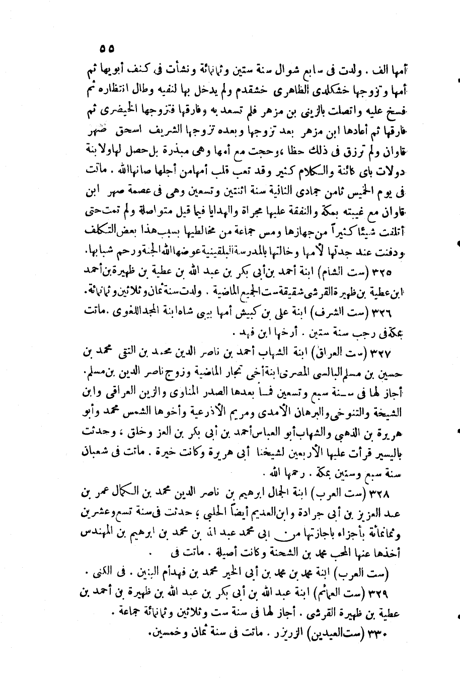 329 - (سِتّ العمائم) ابْنة عبد الله بن أبي بكر بن عبد الله بن ظهيرة بن أَحْمد بن عَطِيَّة بن ظهيرة القرشى. أجَاز لَهَا فِي سنة سِتّ وَثَلَاثِينَ وَثَمَانمِائَة جمَاعَة
